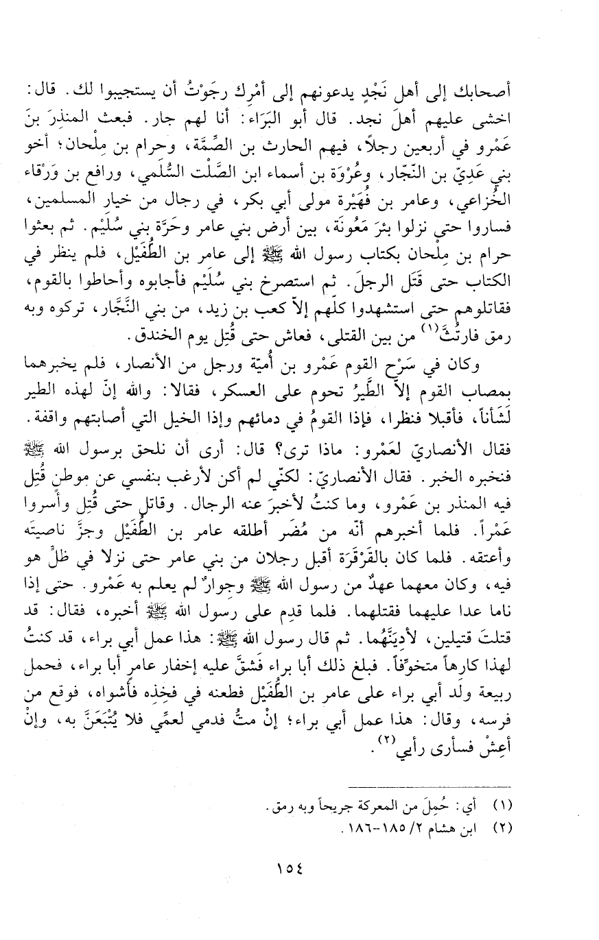 أَصْحَابِكَ إِلَى أَهْلِ نَجْدٍ يَدْعُونَهُمْ إِلَى أَمْرِكَ رَجَوْتُ أَنْ يَسْتَجِيبُوا لَكَ. قَالَ: أَخْشَى عَلَيْهِمْ أَهْلَ نَجْدٍ. قَالَ أَبُو الْبَرَاءِ: أنا لَهُمْ جَارٌ. فَبَعَثَ الْمُنْذَرَ بْنَ عَمْرٍو فِي أَرْبَعِينَ رَجُلًا، فِيهِمُ الْحَارِثُ بْنُ الصِّمَّة، وَحَرَامُ بْنُ مِلْحَانَ؛ أَخُو بَنِي عَدِيِّ بْنِ النَّجَّارِ، وَعُرْوَةُ بن أسماء ابن الصلت السلمي ورافع بْنُ وَرْقَاءَ الْخُزَاعِيُّ، وَعَامِرُ بْنُ فُهَيْرَةَ مَوْلَى أبي بكر، في رجال من خيار المسلمين، فساروا حتى نزلوا بئر معونة، بين أرض بني عَامِرٍ وَحَرَّةِ بَنِي سُلَيْمٍ. ثُمَّ بَعَثُوا حَرَامَ بْنَ مِلْحَانَ بِكِتَابِ رَسُولِ اللَّهِ صَلَّى اللَّهُ عَلَيْهِ وَسَلَّمَ إِلَى عَامِرِ بْنِ الطُّفَيْلِ، فَلَمْ يَنْظُرْ فِي الْكِتَابِ حَتَّى قَتَلَ الرَّجُلُ، ثُمَّ استصرخ بني سليم فأجابوه وأحاطوا بالقوم، فَقَاتَلُوهُمْ حَتَّى اسْتُشْهِدُوا كُلُّهُمْ إِلا كَعْبَ بْنَ زَيْدٍ، مِنْ بَنِي النَّجَّارِ، تَرَكُوهُ وَبِهِ رَمَقٌ فَارتُثَّ مِنْ بَيْنِ الْقَتْلَى، فَعَاشَ حَتَّى قُتِلَ يَوْمَ الْخَنْدَقِ.