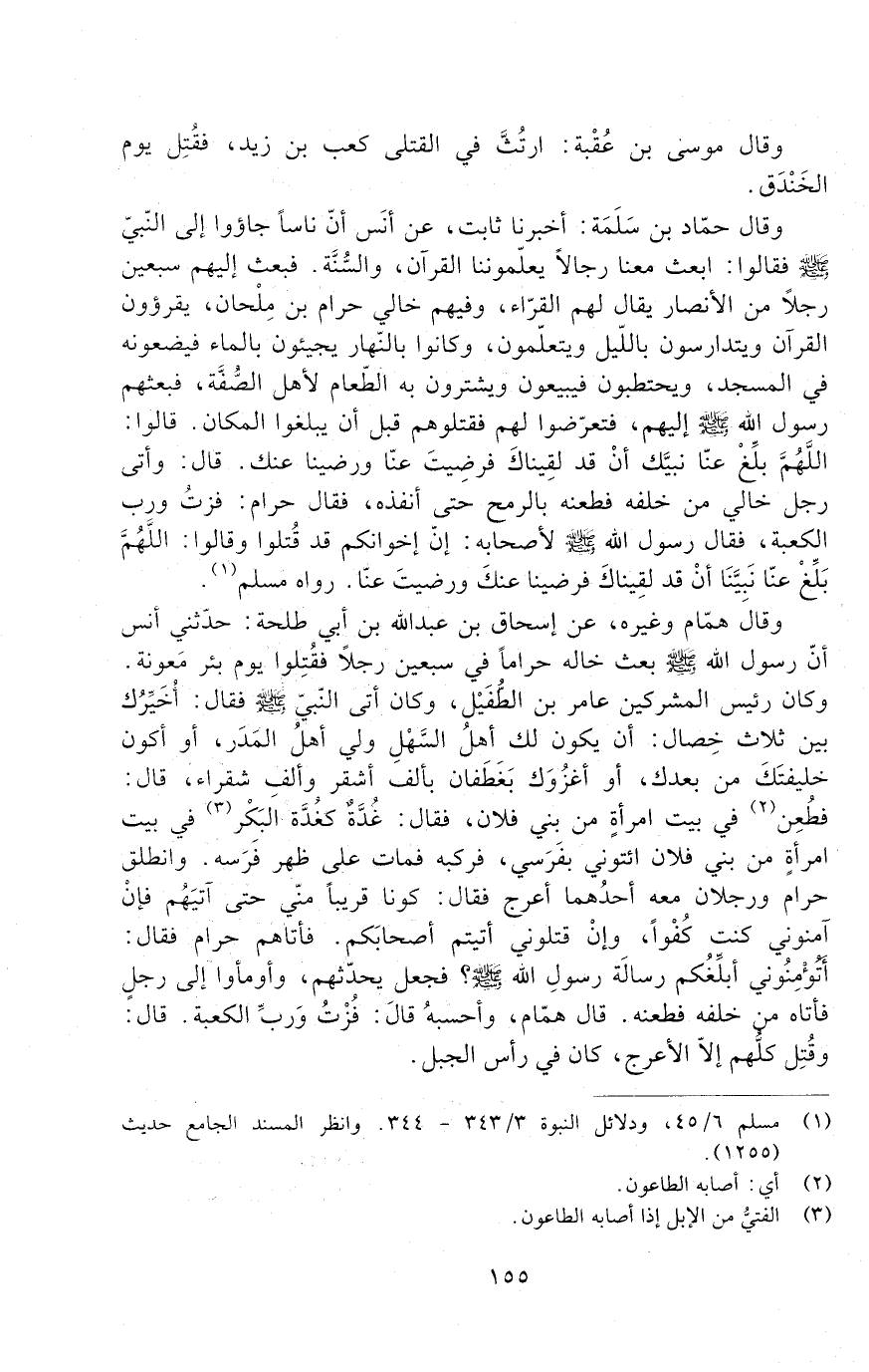 وَقَالَ حماد بن سلمة: أخبرنا ثابت، عن أنس أن ناسا جاؤوا إِلَى النَّبِيِّ صَلَّى اللَّهُ عَلَيْهِ وَسَلَّمَ فَقَالُوا: ابْعَثْ مَعَنَا رِجَالًا يُعَلِّمُونَنَا الْقُرْآنَ، وَالسُّنَّةَ. فَبَعَثَ إِلَيْهِمْ سَبْعِينَ رَجُلًا مِنَ الْأَنْصَارِ يُقَالُ لَهُمْ القراء، وفيهم خالي حرام بن ملحان، يقرؤون الْقُرْآنَ وَيَتَدَارَسُونَ بِاللَّيْلِ وَيَتَعَلَّمُونَ، وَكَانُوا بِالنَّهَارِ يَجِيئُونَ بالماء فيضعونه في المسجد، ويحتطبون فَيَبِيعُونَ وَيَشْتَرُونَ بِهِ الطَّعَامَ لِأَهْلِ الصُّفَّةِ، فَبَعَثَهُمْ رَسُولُ اللَّهِ صَلَّى اللَّهُ عَلَيْهِ وَسَلَّمَ إِلَيْهِمْ، فَتَعَرَّضُوا لَهُمْ فَقَتَلُوهُمْ قَبْلَ أَنْ يَبْلُغُوا الْمَكَانَ. قَالُوا: اللَّهُمَّ بَلِّغْ عَنَّا نَبِيَّكَ أَنْ قَدْ لَقِينَاكَ فَرَضِيتَ عَنَّا وَرَضِينَا عَنْكَ. قَالَ: وَأَتَى رَجُلٌ خَالِي مِنْ خَلْفِهِ فَطَعَنَهُ بِالرُّمْحِ حَتَّى أَنْفَذَهُ، فَقَالَ حَرَامٌ: فُزْتُ وَرَبِّ الْكَعْبَةِ، فَقَالَ رَسُولُ اللَّهِ صَلَّى اللَّهُ عَلَيْهِ وَسَلَّمَ لِأَصْحَابِهِ: إن إخوانكم قد قتلوا، وقالوا: اللَّهُمَّ بَلِّغْ عَنَّا نَبِيَّكَ أَنْ قَدْ لَقِينَاكَ فَرَضِينَا عَنْكَ وَرَضِيتَ عَنَّا. رَوَاهُ مُسْلِمٌ.
