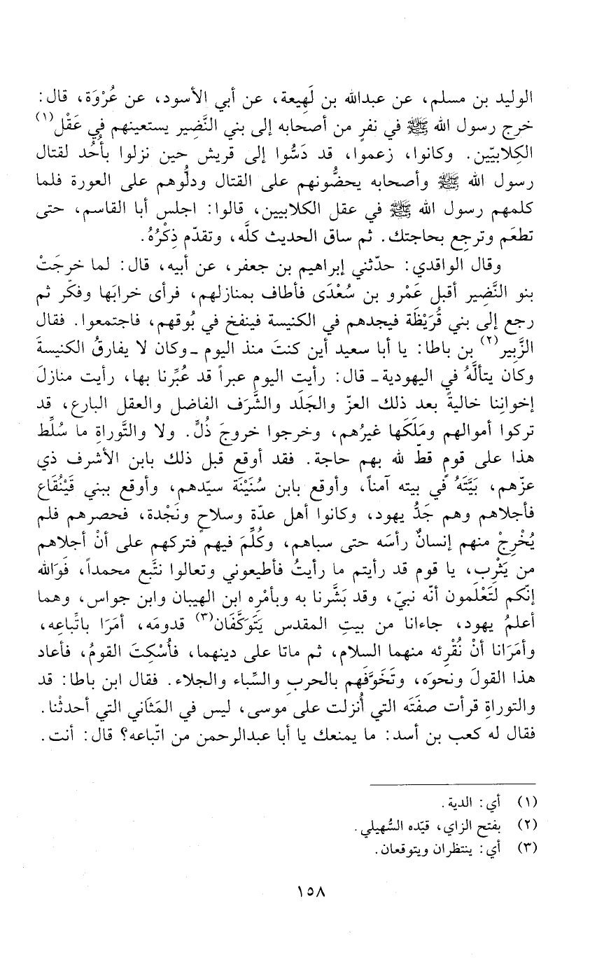 الْوَلِيدُ بْنُ مُسْلِمٍ، عَنْ عَبْدِ اللَّهِ بْنِ لهيعة، عن أبي الأسود، عن عروة، قال: خَرَجَ رَسُولُ اللَّهِ صَلَّى اللَّهُ عَلَيْهِ وَسَلَّمَ فِي نَفَرٍ مِنْ أَصْحَابِهِ إِلَى بَنِي النَّضِيرِ يَسْتَعِينُهُمْ فِي عَقْلِ الْكِلابِيِّينَ. وَكَانُوا زَعَمُوا، قَدْ دَسُّوا إِلَى قُرَيْشٍ حِينَ نَزَلُوا بِأُحُدٍ لِقِتَالِ رَسُول اللَّهِ صَلَّى اللَّهُ عَلَيْهِ وَسَلَّمَ وأصحابه يحضونهم عَلَى الْقِتَالِ وَدَلُّوهُمْ عَلَى الْعَوْرَةِ فَلَمَّا كَلَّمَهُمْ رَسُولُ اللَّهِ صَلَّى اللَّهُ عَلَيْهِ وَسَلَّمَ فِي عَقَلِ الْكِلابِيِّينَ قَالُوا: اجْلِسْ أَبَا الْقَاسِمِ، حَتَّى تَطْعَمَ وَتَرْجِعَ بِحَاجَتِكَ. ثُمَّ سَاقَ الْحَدِيثَ كُلَّهُ وَتَقَدَّمَ ذِكُرُهُ.