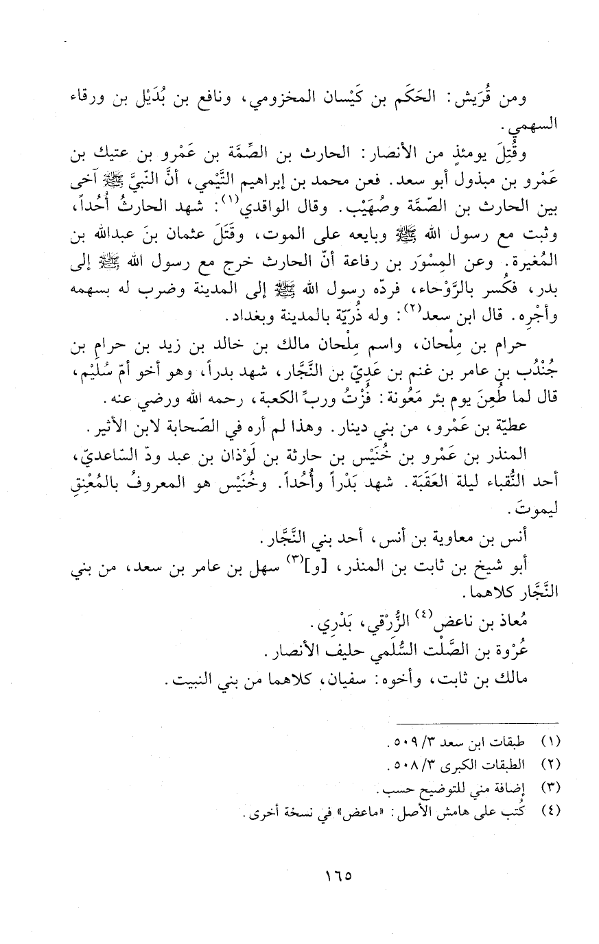 وَقُتِلَ يومئذٍ من الأنصار: الحارث بن الصمة بن عَمْرو بن عتيك بن عَمْرو بن مبذول أبو سعد. فعن محمد بن إبراهيم التَّيْمي، أَنَّ النَّبِيَّ صَلَّى اللَّهُ عَلَيْهِ وَسَلَّمَ آخَى بين الحارث بن الصمة وصُهَيْب. وقال الواقدي: شهد الحارثُ أُحُدًا، وَثَبَتَ مَع رَسُول اللَّهِ صَلَّى اللَّهُ عَلَيْهِ وَسَلَّمَ وبايعه عَلَى الموت، وقتل عثمان بن عبد الله بن المُغيرة. وعن المِسْور بن رفاعة أنّ الحارث خَرَجَ مَعَ رَسُولِ اللَّهِ صَلَّى اللَّهُ عَلَيْهِ وَسَلَّمَ إلى بدر، فكُسر بالرَّوْحاء، فردّه رَسُول اللَّهِ صَلَّى اللَّهُ عَلَيْهِ وَسَلَّمَ إِلَى المدينة وضرب له بسهمه وأجره. قال ابن سعد: وله ذرية بالمدينة وبغداد.