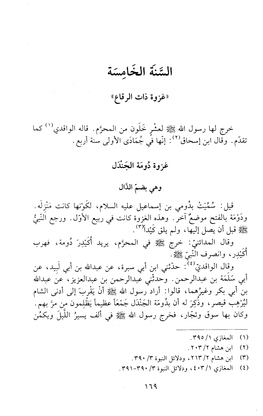 وَقَالَ الْوَاقِدِيُّ: حَدَّثَنِي ابْنُ أَبِي سَبْرَةَ، عَنْ عَبْدِ اللَّهِ بْنِ أَبِي لَبِيدٍ، عَنْ أَبِي سَلَمَةَ بْنِ عَبْدِ الرَّحْمَنِ، وَحَدَّثَنِي عَبْدُ الرَّحْمَنِ بْنُ عَبْدِ الْعَزِيزِ، عَنْ عَبْدِ اللَّهِ بْنِ أَبِي بَكْرٍ وَغَيْرِهِمَا، قَالُوا: أراد رَسُولَ اللَّهِ صَلَّى اللَّهُ عَلَيْهِ وَسَلَّمَ أَنْ يقْرُبَ إِلَى أَدْنَى الشَّامِ لِيُرْهِبَ قَيْصَرَ، وَذُكِرَ لَهُ أَنَّ بِدُومَةِ الْجَنْدَلِ جَمْعًا عَظِيمًا يَظْلِمُونَ مَنْ مَرَّ بِهِمْ. وَكَانَ بِهَا سُوقٌ وتجار، فَخَرَجَ رَسُولُ اللَّهِ صَلَّى اللَّهُ عَلَيْهِ وَسَلَّمَ فِي ألف يَسِيرُ اللَّيْلَ وَيَكْمُنُ