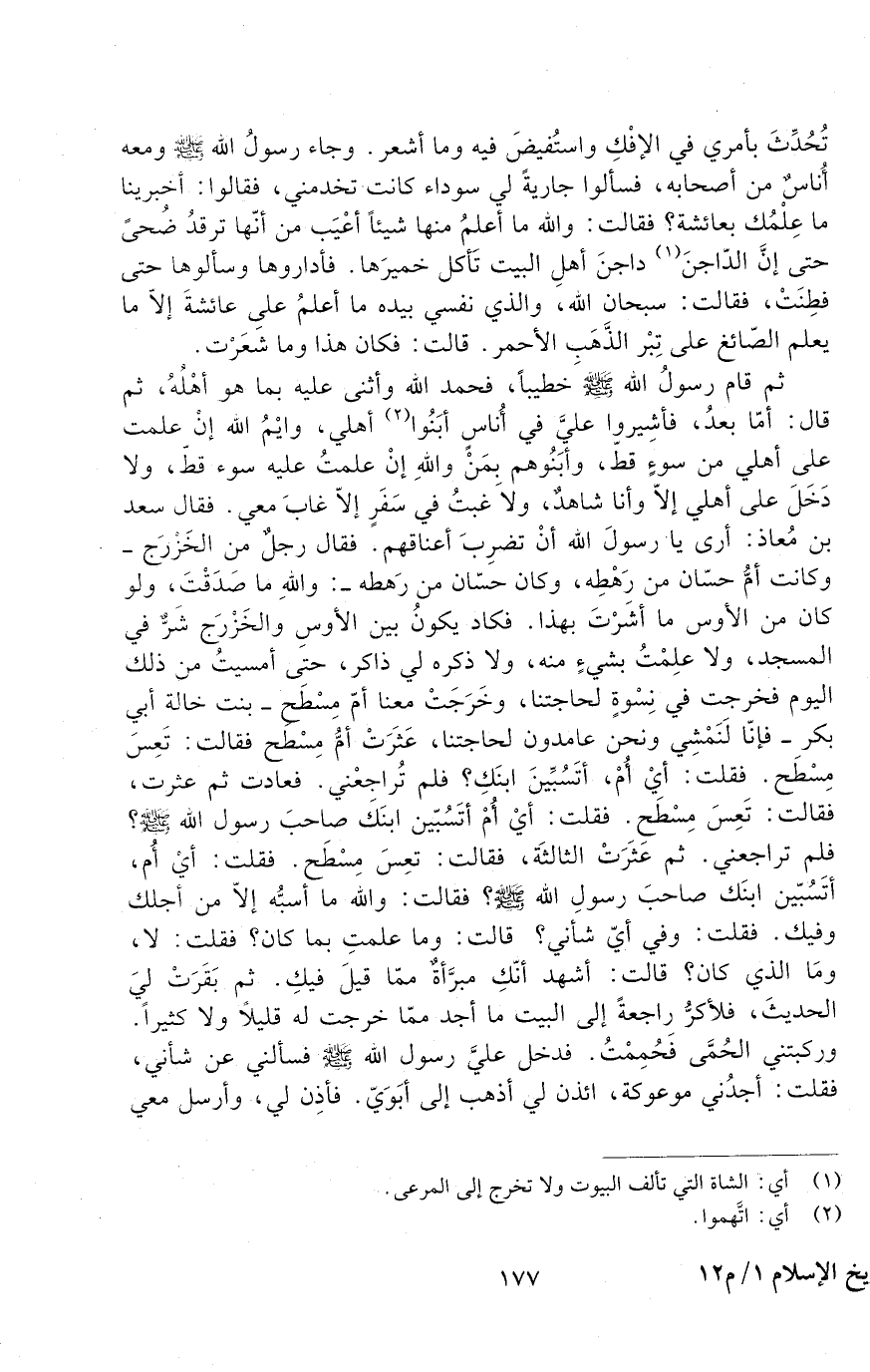 ثُمَّ قَامَ رَسُولُ اللَّهِ صَلَّى اللَّهُ عَلَيْهِ وَسَلَّمَ خَطِيبًا، فَحَمِدَ اللَّهَ وَأَثْنَى عَلَيْهِ بِمَا هُوَ أَهْلُهُ، ثُمَّ قَالَ: أَمَّا بَعْدُ، فَأَشِيرُوا عَلِيَّ فِي أُنَاسٍ أَبَنُوا أَهْلِي، وَايْمُ اللَّهِ إِنْ عَلِمْتُ عَلَى أَهْلِي مِنْ سُوءٍ قَطُّ، وَأَبَنُوهُمْ بِمَنْ، وَاللَّهِ إِنْ عَلِمْتُ عَلَيْهِ سُوءًا قَطُّ، وَلَا دَخَلَ عَلَى أَهْلِي إِلَّا وَأَنَا شَاهِدٌ، وَلَا غِبْتُ فِي سَفَرٍ إِلَّا غَابَ مَعِيَ. فقال سعد بن معاذ: أَرَى يَا رَسُولَ اللَّهِ أَنْ تَضْرِبَ أَعْنَاقَهُمْ. فَقَالَ رَجُلٌ مِنَ الْخَزْرَجِ - وَكَانَتْ أُمُّ حَسَّانَ مِنْ رَهْطِهِ، وَكَانَ حَسَّانُ مِنْ رَهْطِهِ -: وَاللَّهِ مَا صَدَقْتَ، وَلَوْ كَانَ مِنَ الْأَوْسِ مَا أَشَرْتَ بِهَذَا. فَكَادَ يَكُونُ بَيْنَ الْأَوْسِ وَالْخَزْرَجِ شَرٌّ فِي الْمَسْجِدِ، وَلَا عَلِمْتُ بِشَيْءٍ مِنْهُ، ولا ذكره لي ذاكر. حتى أَمْسَيْتُ مِنْ ذَلِكَ الْيَوْمِ فَخَرَجْتُ فِي نِسْوَةٍ لِحَاجَتِنَا، وَخَرَجَتْ مَعَنَا أُمُّ مِسْطَحٍ - بِنْتُ خَالَةِ أبي بكر - فَإِنَّا لَنَمْشِي وَنَحْنُ عَامِدُونَ لِحَاجَتِنَا، عَثَرَتْ أَمُّ مِسْطَحٍ فَقَالَتْ: تَعِسَ مِسْطَحٌ. فَقُلْتُ: أَيْ أُمْ، أتسبين ابنك؟ فلم تراجعني. فعادت ثم عثرت فَقَالَتْ: تَعِسَ مِسْطَحٌ. فَقُلْتُ: أَيْ أُمْ أَتَسُبِّينَ ابنك صَاحِبِ رَسُولِ اللَّهِ صَلَّى اللَّهُ عَلَيْهِ وَسَلَّمَ؟ فلم تراجعني. ثم عثرت ثالثة فَقَالَتْ: تَعِسَ مِسْطَحٌ. فَقُلْتُ: أَيْ أُمْ، أَتَسُبِّينَ ابنك صَاحِبِ رَسُولِ اللَّهِ صَلَّى اللَّهُ عَلَيْهِ وَسَلَّمَ؟ فَقَالَتْ: وَاللَّهِ مَا أَسُبُّهُ إِلَّا مِنْ أَجْلِكِ وَفِيكِ. فَقُلْتُ: وَفِي أَيِّ شَأْنِي؟ قَالَتْ: وَمَا عَلِمْتِ بِمَا كَانَ؟ فَقُلْتُ: لَا، وَمَا الَّذِي كَانَ؟ قَالَتْ: أَشْهَدُ أَنَّكِ مُبَرَّأةٌ مِمَّا قيل فيك. ثم بقرت لي الحديث، فلأكر رَاجِعَةً إِلَى الْبَيْتِ مَا أَجِدُ مِمَّا خَرَجْتُ لَهُ قَلِيلًا وَلَا كَثِيرًا. وَرَكِبَتْنِي الْحُمَّى فَحُمِمْتُ. فدخل عَلَى رَسُولِ اللَّهِ صَلَّى اللَّهُ عَلَيْهِ وَسَلَّمَ فَسَأَلَنِي عَنْ شَأْنِي، فَقُلْتُ: أَجِدُنِي مَوْعُوكَةً، ائْذَنْ لِي أَذْهَبُ إِلَى أَبَوَيَّ. فَأَذِنَ لِي، وأرسل معي