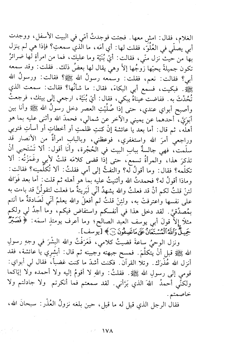 الْغُلَامَ، فَقَالَ: امْشِ مَعَهَا. فَجِئْتُ فَوَجَدْتُ أُمِّي فِي الْبَيْتِ الْأَسْفَلِ، وَوَجَدْتُ أَبِي يُصَلِّي فِي الْعُلُوِّ فَقُلْتُ لَهَا: أيْ أُمَّهْ، مَا الَّذِي سَمِعْتِ؟ فَإِذَا هِي لَمْ يَنْزِلْ بِهَا مِنْ حَيْثُ نَزَلَ مِنِّي، فَقَالَتْ: أَيْ بُنَيَّةَ وَمَا عَلَيْكَ، فَمَا مِنَ امْرَأَةٍ لَهَا ضَرَائِرُ تَكُونُ جَمِيلَةً يُحِبُّهَا زَوْجُهَا إِلَّا وَهِيَ يُقَالُ لَهَا بَعْضُ ذَلِكَ. فَقُلْتُ: وَقَدْ سَمِعَهُ أَبِي؟ فَقَالَتْ: نَعَمْ، فَقُلْتُ: وَسَمِعَهُ رَسُولُ اللَّهِ صَلَّى اللَّهُ عَلَيْهِ وَسَلَّمَ؟ فَقَالَتْ: ورسول الله صلى الله عليه وسلم فَبَكَيْتُ، فَسَمِعَ أَبِي الْبُكَاءَ، فَقَالَ: مَا شَأْنُهَا؟ فقالت: سَمِعْتُ الَّذِي تُحُدِّثَ بِهِ. فَفَاضَتْ عَيْنَاهُ يَبْكِي، فَقَالَ: أَيْ بُنَيَّةَ، ارْجِعِي إِلَى بَيْتِكِ، فَرَجَعْتُ، وَأَصْبَحَ أَبَوَايَ عِنْدِي، حَتَّى إِذَا صَلَّيْتُ الْعَصْرَ دَخَلَ رَسُولُ اللَّهِ صَلَّى اللَّهُ عَلَيْهِ وَسَلَّم وَأَنَا بَيْنَ أَبَوَيَّ، أَحَدُهُمَا عَنْ يَمِينِي وَالْآخَرُ عَنْ شِمَالِي، فَحَمِدَ اللَّهَ وَأَثْنَى عَلَيْهِ بِمَا هُوَ أَهْلُهُ، ثُمَّ قَالَ: أَمَّا بَعْدُ يَا عَائِشَةُ إِنْ كُنْتِ ظَلَمْتِ أَوْ أَخْطَأَتِ أَوْ أَسَأْتِ فَتُوبِي وَرَاجِعِي أَمْرَ اللَّهِ وَاسْتَغْفِرِي، فَوَعَظَنِي، وَبِالْبَابِ امْرَأَةٌ مِنَ الْأَنْصَارِ قَدْ سَلَّمَتْ، فَهِيَ جَالِسَةٌ بِبَابِ الْبَيْتِ فِي الْحُجْرَةِ، وَأَنَا أَقُولُ: ألا تستحيي أَنْ تَذْكُرَ هَذَا، وَالْمَرْأَةُ تَسْمَعُ، حَتَّى إِذَا قَضَى كَلَامَهُ قُلْتُ لِأَبِي وَغَمَزْتُهُ: أَلَا تُكَلِّمَهُ؟ فَقَالَ: وَمَا أَقُولُ لَهُ؟ وَالْتَفَتُّ إِلَى أُمِّي فَقُلْتُ: أَلَا تُكَلِّمِينَهُ؟ فَقَالَتْ: وَمَاذَا أَقُولُ لَهُ؟ فَحَمِدْتُ اللَّهَ وَأَثْنَيْتُ عَلَيْهِ بِمَا هُوَ أَهْلُهُ ثُمَّ قُلْتُ: أَمَّا بَعْدُ فَوَاللَّهِ لَئِنْ قُلْتُ لَكُمْ أَنْ قَدْ فَعَلْتُ وَاللَّهُ يَشْهَدُ أَنِّي لَبَرِيئَةٌ مَا فَعَلْتُ لَتَقُولَنَّ قَدْ بَاءَتْ بِهِ عَلَى نَفْسِهَا وَاعْتَرَفَتْ بِهِ، وَلَئِنْ قُلْتُ لَمْ أَفْعَلْ وَاللَّهُ يَعْلَمُ أَنِّي لَصَادِقَةٌ مَا أَنْتُمْ بِمُصَدِّقيِّ. لَقَدْ دَخَلَ هَذَا فِي أَنْفُسِكُمْ وَاسْتَفَاضَ فِيكُمْ، وَمَا أَجِدُ لِي وَلَكُمْ مَثَلًا إِلَّا قَوْلَ أَبِي يُوسُفَ الْعَبْدِ الصَّالِحِ؛ وَمَا أَعْرِفُ يَوْمَئِذٍ اسْمَهُ: " فَصَبْرٌ جَمِيلٌ وَاللَّهُ الْمُسْتَعَانُ عَلَى مَا تَصِفُونَ ".