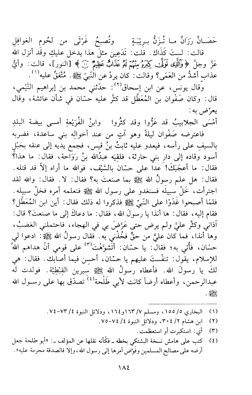 فَاعْتَرَضَهُ صَفْوَانُ لَيْلَةً وَهُوَ آتٍ مِنْ عِنْدِ أَخْوَالِهِ بَنِي سَاعِدَةَ، فَضَرَبَهُ بِالسَّيْفِ عَلَى رَأْسِهِ، فَيَعْدُو عَلَيْهِ ثَابِتُ بْنُ قَيْسٍ فَجَمَعَ يَدَيْهِ إِلَى عُنُقِهِ بِحَبْلٍ أَسْوَدَ وَقَادَهُ إِلَى دَارِ بَنِي حَارِثَةَ، فَلَقِيَهُ عَبْدُ اللَّهِ بْنُ رَوَاحَةَ فَقَالَ: مَا هَذَا؟ فَقَالَ: مَا أَعْجَبَكَ! عَدَا عَلَى حَسَّانٍ بِالسَّيْفِ، فَوَاللَّهِ مَا أَرَاهُ إِلا قَدْ قَتَلَهُ. فَقَالَ: هَلْ عَلِمَ رَسُولِ اللَّهِ صَلَّى اللَّهُ عَلَيْهِ وَسَلَّمَ بما صَنَعْتَ بِهِ؟ فَقَالَ: لا. فَقَالَ: وَاللَّهِ لَقَدِ اجترأت، خل سبيله. فسنغدوا عَلَى رَسُولِ اللَّهِ صَلَّى اللَّهُ عَلَيْهِ وَسَلَّمَ فنعلمه أمره فخلِّ سَبِيلَهُ. فَلَمَّا أَصْبَحُوا غَدَوْا عَلَى النَّبِيِّ صَلَّى اللَّهُ عَلَيْهِ وَسَلَّمَ فَذَكَرُوا لَهُ ذَلِكَ فَقَالَ: أين ابن المعطل؟ فقام إليه، فقال: ها أنذا يَا رَسُولَ اللَّهِ، فَقَالَ: مَا دَعَاكَ إِلَى مَا صَنَعْتَ؟ قَالَ: آذَانِي وَكَثَّرَ عَلَيَّ وَلَمْ يَرْضَ حَتَّى عَرَّضَ بِي فِي الْهِجَاءِ، فَاحْتَمَلَنِي الغضب، وها أنذا، فَمَا كَانَ عَلَيَّ مِنْ حَقٍّ فَخُذْنِي بِهِ. فَقَالَ رَسُولُ اللَّهِ صَلَّى اللَّهُ عَلَيْهِ وَسَلَّمَ: ادعوا لي حسان، فَأَتَى بِهِ؛ فَقَالَ: يَا حَسَّانُ: أَتَشَوَّهْتَ عَلَى قَوْمِي أَنْ هَدَاهُمُ اللَّهُ لِلإِسْلامِ، يَقُولُ: تَنَفَّسْتَ عَلَيْهِمْ يَا حَسَّانُ، أَحْسِنْ فِيمَا أَصَابَكَ. فَقَالَ: هِيَ لَكَ يَا رَسُولَ اللَّهِ. فَأَعْطَاهُ رَسُولُ اللَّه صَلَّى اللَّهُ عَلَيْهِ وَسَلَّمَ سِيرِينَ الْقِبْطِيَّةَ. فَوَلَدَتْ لَهُ عَبْدَ الرَّحْمَنِ، وَأَعْطَاهُ أَرْضًا كَانَتْ لأَبِي طَلْحَةَ تَصَدَّقَ بِهَا عَلَى رَسُولِ اللَّهِ صَلَّى اللَّهُ عَلَيْهِ وَسَلَّمَ.