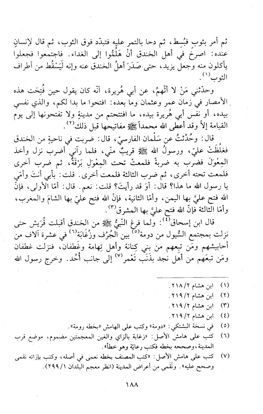 قال: وحدثت عن سلمان الفارسيّ قَالَ: ضربت في ناحيةٍ من الخندق فغلُظَتْ عليّ، ورَسُول اللَّهِ صَلَّى اللَّهُ عَلَيْهِ وَسَلَّمَ قريبٌ منّي، فلما رآني أضرب نزل وأخذ المِعْوَلَ فضرب به ضربة فلمعتْ تحت المِعْوَل بَرْقَةٌ، ثُمَّ ضرب أخرى فلمعت تحته أخرى، ثُمَّ ضرب الثالثة فلمعت أخرى. قلت: بأبي أنت وَأُمِّي يَا رَسُولَ اللَّهِ مَا هَذَا؟ قَالَ: أوَ قد رأيتَ؟ قلت: نعم. قَالَ: أمّا الأولى، فإنّ الله فتح عليّ بِهَا اليمن، وأمّا الثانية، فإنّ الله فتح عليّ بِهَا الشامَ والمغرب، وأمّا الثالثة فإنّ الله فتح عليّ بِهَا المشرق.