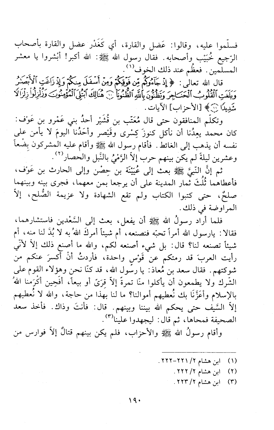 فلما أراد رَسُولَ اللَّهِ صَلَّى اللَّهُ عَلَيْهِ وَسَلَّمَ إِنَّ يفعل، بعث إلى السَّعْدين فاستشارهما فقالا: يَا رَسُولَ اللَّهِ أمرًا تحبّه فنصنعه، أم شيئًا أمرك الله به لا بُدَّ لنا منه، أم شيئًا تصنعه لنا؟ قَالَ: بل شيء أصنعه لكم، والله ما أصنع ذَلِكَ إلّا لأنّي رأيت العربَ قد رمتكم عَنْ قَوسٍ واحدة، فأردت أنْ أكسر عنكم من شوكتهم. فقال سعد بن مُعاذ: يَا رَسُولَ اللَّهِ، قد كنّا نحن وهؤلاء القوم عَلَى الشرك ولا يطعمون أن يأكلوا منّا تمرة إلّا قِرًى أو بيعًا، أَفَحِين أكرمنا الله بالِإسلام وأَعَزَّنَا بك نعطيهم أموالنا؟ ما لنا بهذا من حاجة، والله لا نعطيهم إلّا السَّيف حتى يحكم الله بيننا وبينهم. قَالَ: فأنتَ وذاك. فأخذ سعد الصحيفة فمحاها، ثُمَّ قَالَ: ليجهدوا علينا.