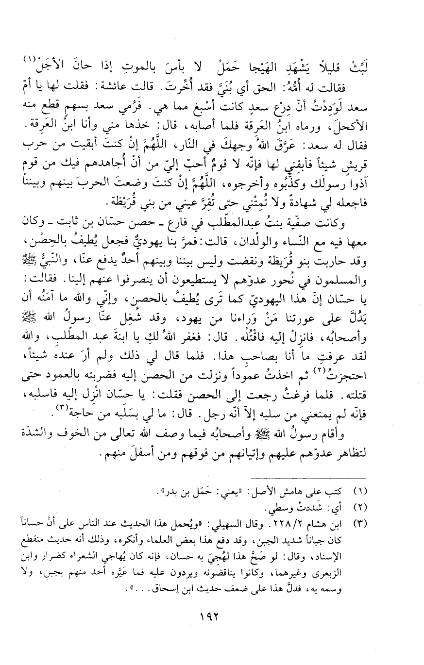 وكانت صفية بنتُ عبد المطّلب في فارع - حصن حسّان بن ثابت - وكان معها فيه مع النّساء والولْدان. قَالَتْ: فمرّ بنا يهودي فجعل يطيف بالحصْن، وقد حاربت بنو قُرَيظة ونقضت وليس بيننا وبينهم أحدٌ يدفع عنّا، والنّبيّ صَلَّى اللَّهُ عَلَيْهِ وَسَلَّمَ والمسلمون في نُحور عدوّهم لا يستطيعون أن ينصرفوا عنهم إلينا. فقالت: يا حسّان إنّ هذا اليهوديّ كما ترى يطيف بالحصن، وإني والله ما آمنُه أن يدل عَلَى عورتنا من وَراءنا من يهود، وقد شُغِل عنّا رَسُول اللَّهِ صَلَّى اللَّهُ عَلَيْهِ وَسَلَّمَ وأصحابه، فانزل إليه فاقتله. قال: فغفر الله لك يا ابنةَ عبد المطّلب، والله لقد عرفت ما أنا بصاحب هذا. فلما قَالَ لي ذَلِكَ ولم أر عنده شيئًا، احتجزت ثُمَّ أخذت عمودًا ونزلت من الحصن إليه فضربته بالعمود حتى قتلته. فلما فرغتُ رجعت إلى الحصن فقلت: يا حسّان انزل إليه فاسلبه، فإنّه لم يمنعني من سلبه إلّا أنّه رجل. قال: ما لي بسَلَبه من حاجة.