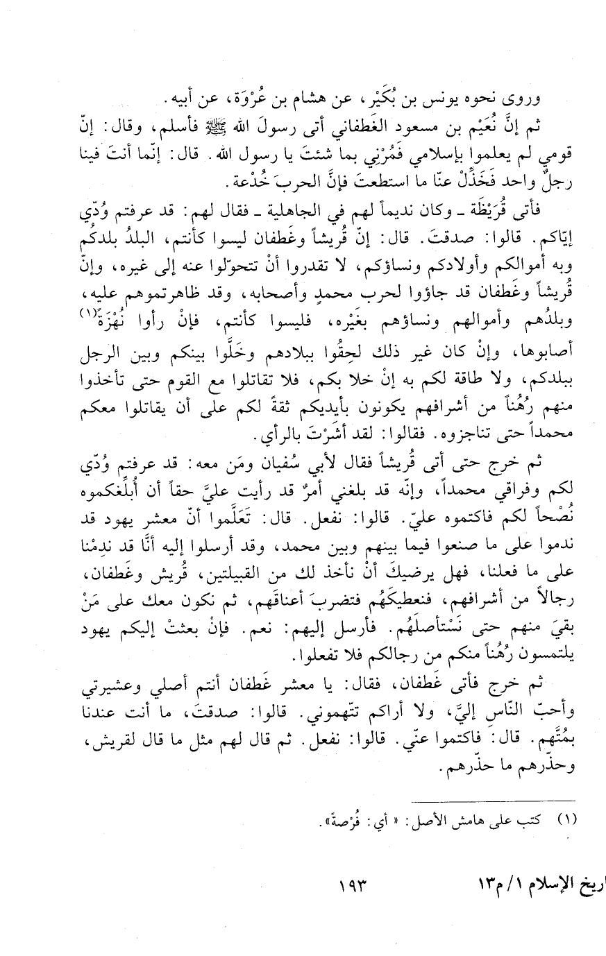 فأتى قريظة - وكان نديمًا لهم في الجاهلية - فقال لهم: قد عرفتم وُدّي إيّاكم. قالوا: صدقتَ. قَالَ: إنّ قريشًا وغَطفان ليسوا كأنتم، البلد بلدكم وبه أموالكم وأولادكم ونساؤكم، لا تقدروا أن تتحولوا عنه إلى غيره، وإن قريشا وغطفان قد جاؤوا لحرب محمدٍ وأصحابه، وقد ظاهرتموهم عليه، وبلدُهم وأموالهم ونساؤهم بغيره، فليسوا كأنتم، فإنْ رأوا نهزة أصابوها، وإنْ كان غير ذَلِكَ لحقوا ببلادهم وخلوا بينكم وبين الرجل ببلدكم، ولا طاقة لكم به إنْ خلا بكم، فلا تقاتلوا مع القوم حتى تأخذوا منهم رَهنًا من أشرافهم يكونون بأيديكم ثقة لكم عَلَى أن يقاتلوا معكم محمدًا حتى تناجزوه، فقالوا: لقد أشرت بالرأي.