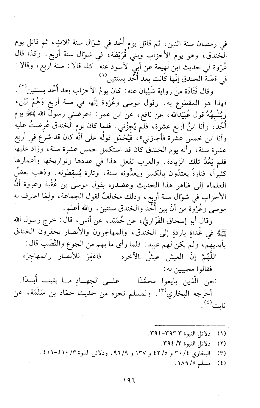 وقال قَتَادة من رواية شَيْبان عنه: كان يومُ الأحزاب بعد أُحُد بسنتين، فهذا هو المقطوع به. وقول موسى وعُرْوة: إنّها في سنة أربعٍ وَهَمٌ بين، ويُشْبُهُه قول عُبَيْد اللَّهِ، عَنْ نَافِعٍ، عَنِ ابْنِ عُمَر: " عرضني رَسُول اللَّهِ صَلَّى اللَّهُ عَلَيْهِ وَسَلَّمَ يَوْمَ أُحُد، وَأَنَا ابنُ أَرْبَعَ عَشْرَةَ، فَلَمْ يُجِزْني. فلما كان يوم الخندق عُرِضتُ عليه وأنا ابن خمس عشرة فأجازني " فيُحْمَل قولُه عَلَى أنّه كان قد شرع في أربع عشرة، وأنه يوم الخندق كان قد استكمل خمس عشرة سنة، وزاد عليها فلم يعد تلك الزيادة. والعرب تفعل هذا في عددها وتواريخها وأعمارها كثيرًا، فتارة يعتدّون بالكسر ويعدُّونه سنة، وتارة يُسقِطونه. وذهب بعض العلماء إلى ظاهر هذا الحديث وعضَّدوه بقول موسى بن عقبة وعروة أن الأحزاب في شوّال سنة أربع، وذلك مخالفٌ لقول الجماعة، ولما اعترف به موسى وعُرْوة من أنّ بين أُحُد والخندق سنتين، والله أعلم.