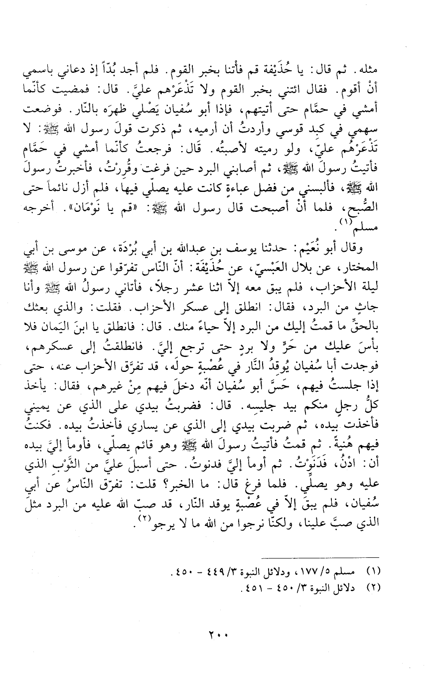 مِثْلَهُ. ثُمَّ قَالَ: يَا حُذَيْفَةُ قُمْ فَائْتِنَا بِخَبَرِ الْقَوْمِ. فَلَمْ أَجِدْ بُدًّا إِذْ دَعَانِي بِاسْمِي أَنْ أَقُومَ. فَقَالَ ائْتِنِي بِخَبَرِ الْقَوْمِ وَلَا تَذْعَرْهُمْ عَلَيَّ. قَالَ: فَمَضَيْتُ كَأَنَّمَا أَمْشِي فِي حَمَّامٍ حَتَّى أَتَيْتُهُمْ، فَإِذَا أَبُو سُفْيَانَ يُصْلِي ظَهْرَهُ بِالنَّارِ. فَوَضَعْتُ سَهْمِي فِي كَبِدِ قَوْسِي وَأَرَدْتُ أَنْ أَرْمِيَهُ، ثُمَّ ذَكَرْتُ قَوْلَ رَسُولُ اللَّهِ صَلَّى اللَّهُ عَلَيْهِ وَسَلَّمَ: لا تَذْعَرْهُمْ عَلِيَّ، وَلَوْ رَمَيْتُهُ لَأصَبْتُهُ. قَالَ: فَرَجَعْتُ كَأَنَّمَا أَمْشِي فِي حَمَّامٍ، فَأَتَيْتُ رَسُولَ اللَّهِ صَلَّى اللَّهُ عَلَيْهِ وَسَلَّمَ، ثُمَّ أَصَابَنِي الْبَرْدُ حين فرغت وقررت، فأخبرت رَسُولَ اللَّهِ صَلَّى اللَّهُ عَلَيْهِ وَسَلَّمَ فَأَلْبَسَنِي مِنْ فَضْلِ عَبَاءَةٍ كَانَتْ عَلَيْهِ يُصَلِّي فِيهَا، فَلَمْ أَزَلْ نَائِمًا حَتَّى الصُّبْحِ، فَلَمَّا أَنْ أَصْبَحْتُ قَالَ رَسُولُ اللَّهِ صَلَّى اللَّهُ عَلَيْهِ وَسَلَّمَ: " قُمْ يَا نَوْمَانُ ". أَخْرَجَهُ مُسْلِمٌ.