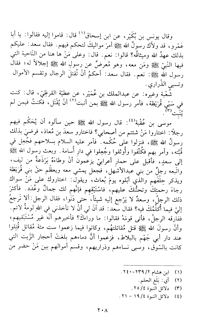 وَقَالَ يُونُسُ بْنُ بُكَيْرٍ، عَنِ ابْنِ إِسْحَاقَ قال: قاموا إليه فقالوا: يا أبا عَمْرو، قد ولّاك رَسُولَ اللَّهِ - صَلَّى اللَّهُ عَلَيْهِ وَسَلَّمَ - أَمَرَ مواليك لتحكم فيهم. فقال سعد: عليكم بذلك عهدُ الله وميثاقه؟ قالوا: نعم. قَالَ: وعلى مَنْ ها هنا من النّاحية التي فيها النّبيّ - صَلَّى اللَّهُ عَلَيْهِ وَسَلَّمَ - ومَن معه، وهو مُعرضٌ عَنْ رَسُول اللَّهِ - صَلَّى اللَّهُ عَلَيْهِ وَسَلَّمَ - إجلالًا له؛ فَقَالَ رَسُول اللَّهِ - صَلَّى اللَّهُ عَلَيْهِ وَسَلَّمَ -: نعم. فقال سعد: أحكم أن تقتل الرجال وتقسم الأموال وتسبى الذراري.