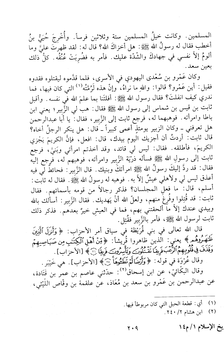 المسلمين. وكانت خيل المسلمين ستة وثلاثين فرسًا. وأخرج حُيَيّ بنَ أخطب فقال له رسول الله - صلى الله عليه وسلم -: هل أخزاك الله؟ قال له: لقد ظهرتَ عليَّ وما ألوم إلّا نفسي في جهادك والشدة عليك. فأمر به فضُرِبَتْ عُنُقُه. كلّ ذَلِكَ بعين سعد.