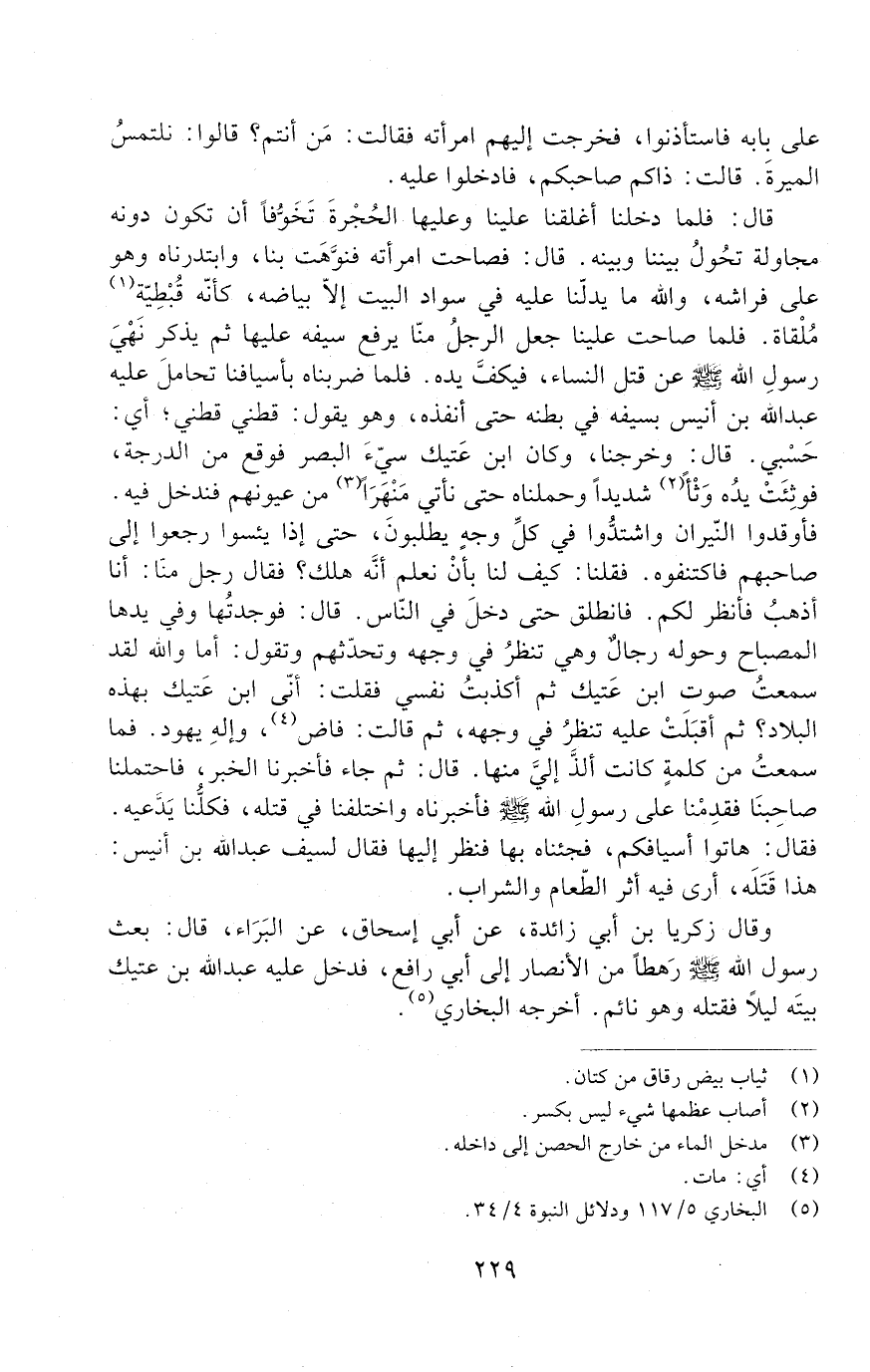 قال: فلما دخلنا أغلقنا علينا وعليها الحجرة تخوفا أن تكون دونه مجاولة تحُول بيننا وبينه. قَالَ: فصاحت امرأته فنَّوَهت بنا، وابتدرناه وهو عَلَى فراشه، والله ما يدلّنا عَلَيْهِ فِي سواد البيت إلّا بياضه، كأنّه قِبْطِيّة مُلْقاه. فلما صاحت علينا جعل الرجل منّا يرفع سيفه عليها ثُمَّ يذكر نَهْيَ رَسُول اللَّهِ - صَلَّى اللَّهُ عَلَيْهِ وَسَلَّمَ - عَنْ قتل النساء، فيكف يده. فلما ضربناه بأسيافنا تحامل عَلَيْهِ عَبْد الله بْن أنيس بسيفه فِي بطنه حتى أنفذه، وهو يَقْولُ: قطني قطني، أي حسبي. قال: وخرجنا، وكان ابن عتيك سيئ البصر فوقع من الدرجة، فوثئت يده وثأ شديدًا وحملناه حتى نأتي مَنْهَرًا من عيونهم فندخل فِيهِ. فأوقدوا النّيران واشتدّوا فِي كلّ وجه يطلبون، حتى إذا يئسوا رجعوا إلى صاحبهم فاكتنفوه. فقلنا: كيف لنا بأن نعلم أنّه هلك؟ فقال رَجُل منّا: أَنَا أذهب فأنظر لكم. فانطلق حتى دخل فِي النّاس. قَالَ: فوجدتُها وفي يدها المصباح وحوله رجال وهي تنظر فِي وجهه وتحدّثهم وتقول: أما والله لقد سَمِعْتُ صوت ابن عَتيك ثُمَّ أكذبت نفسي فقلت: أنّي ابن عَتيك بهذه البلاد؟ ثُمَّ أقبَلَتْ عَلَيْهِ تنظر فِي وجهه، ثُمَّ قَالَتْ: فاض، وإله يهود. فما سَمِعْتُ من كلمة كانت ألذّ إليّ منها. قَالَ: ثُمَّ جاء فأخبرنا الخبر، فاحتملنا صاحبَنا فقدِمْنا عَلَى رَسُول اللَّهِ - صَلَّى اللَّهُ عَلَيْهِ وَسَلَّمَ - فأخبرناه واختلفنا فِي قتله، فكلّنا يدّعيه. فقال: هاتوا أسيافكم. فجئناه بِهَا، فنظر إليها فقال لسيف عَبْد الله بْن أنيس: هذا قَتَلَه، أرى فِيهِ أثر الطّعام والشراب.