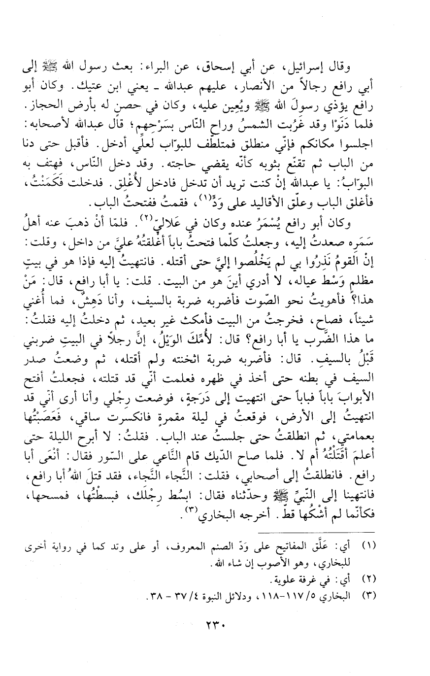 وَكَانَ أَبُو رَافِعٍ يُسْمَرُ عِنْدَهُ وَكَانَ فِي عَلالِيٍّ. فَلَمَّا أَنْ ذَهَبَ عَنْهُ أَهْلُ سَمَرِهِ صَعَدْتُ إِلَيْهِ، وَجَعَلْتُ كلما فتحت بابا أغلقته عَلَيَّ مِنْ دَاخِلٍ، وَقُلْتُ: إِنَّ الْقَوْمَ نَذَرُوا بِي لَمْ يَخْلُصُوا إِلَيَّ حَتَّى أَقْتُلَهُ. فَانْتَهَيْتُ إِلَيْهِ فَإِذَا هُوَ فِي بَيْتٍ مُظْلِمٍ وَسْطَ عِيَالِهِ، لا أَدْرِي أَيْنَ هُوَ مِنَ الْبَيْتِ. قُلْتُ: يَا أَبَا رَافِعٍ، قَالَ: مَنْ هَذَا؟ فَأَهْوَيْتُ نَحْوَ الصَّوْتِ فَأَضْرِبُهُ ضَرْبَةً بِالسَّيْفِ، وَأَنَا دَهِشٌ، فَمَا أَغْنَى شَيْئًا، فَصَاحَ، فَخَرَجْتُ مِنَ الْبَيْتِ فَأَمْكُثُ غَيْرَ بَعِيدٍ، ثُمَّ دَخَلْتُ إِلَيْهِ فَقُلْتُ: مَا هَذَا الضَّرْبُ يَا أَبَا رَافِعٍ؟ قَالَ: لأُمِّكَ الْوَيْلُ، إِنَّ رَجُلا فِي الْبَيْتِ ضَرَبَنِي قَبْلُ بِالسَّيْفِ. قَالَ: فَأَضْرِبُهُ ضَرْبَةً أَثْخَنْتُهُ وَلَمْ أَقْتُلْهُ، ثُمَّ وَضَعْتُ صَدْرَ السَّيْفِ فِي بَطْنِهِ حَتَّى أَخَذَ فِي ظَهْرِهِ فَعَلِمْتُ أَنِّي قَدْ قَتَلْتُهُ، فَجَعَلْتُ أَفْتَحُ الأَبْوَابَ بَابًا فَبَابًا حَتَّى انْتَهَيْتُ إِلَى دَرَجَةٍ، فَوَضَعْتُ رِجْلِي وَأَنَا أَرَى أَنِّي قَدِ انْتَهَيْتُ إِلَى الأَرْضِ، فَوَقَعْتُ - فِي لَيْلَةٍ مُقْمِرَةٍ - فَانْكَسَرَتْ سَاقِي، فَعَصَبْتُهَا بِعِمَامَتِي، ثم انطلقت حتى جلست عند الباب. فقلت: لا أَبْرَحُ اللَّيْلَةَ حَتَّى أَعْلَمَ أَقَتَلْتُهُ أَمْ لا. فَلَمَّا صَاحَ الدِّيكُ قَامَ النَّاعِي عَلَى السُّورِ فَقَالَ: أَنْعِي أَبَا رَافِعٍ. فَانْطَلَقْتُ إِلَى أَصْحَابِي، فَقُلْتُ: النَّجَاءَ النَّجَاءَ، فَقَدْ قَتَلَ اللَّهُ أَبَا رَافِعٍ. فَانْتَهَيْنَا إِلَى النَّبِيِّ - صَلَّى اللَّهُ عَلَيْهِ وَسَلَّمَ - وَحَدَّثْنَاهُ فَقَالَ: ابْسُطْ رِجْلَكَ. فَبَسَطْتُهَا. فَمَسَحَهَا، فَكَأَنَّمَا لَمْ أشْكُهَا قَطُّ. أَخْرَجَهُ الْبُخَارِيُّ.