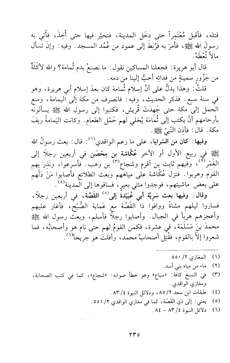 وقال: وفيها بعث سرية أبي عبيدة إلى القَصَّة، فِي أربعين رجلًا، فساروا ليلهم مشاةً ووافوا ذا القصة مع عماية الصُّبح. فأغار عليهم وأعجزهم هربًا فِي الجبال. وأصابوا رجلا فأسلم. وبعث رسول الله - صلى الله عليه وسلم - محمدَ بْن مسلمة فِي عشرة، فكمن القومُ لهم حتى نام هُوَ وأصحابه، فما شعروا إلا بالقوم. فقتل أصحاب محمد، وأفلت هو جريحا.