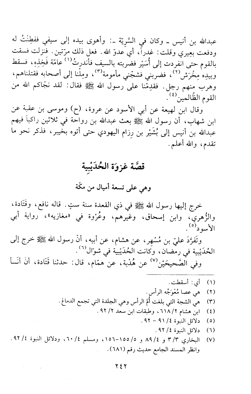 عَبْد الله بْن أنيسَ - وكان فِي السَرِيَّةٌ -: وأهوى بيده إلى سيفي ففطِنْتُ لَهُ ودفعت بعِيري وقلت: غدرًا، أي عدوّ الله. فعل ذَلِكَ مرّتين. فنزلت فسقت بالقوم حتى انفردت إلى أُسَيْر فضربته بالسيف فأندرتُ عامة فخذه، فسقط وبيده مخرش فضربني فشجّني مأمومة، ومِلنا إلى أصحابه فقتلناهم، وهرب منهم رَجُل. فقدِمْنا عَلَى رَسُولِ اللَّهِ - صَلَّى اللَّهُ عَلَيْهِ وَسَلَّمَ - فقال: لقد نجاكم الله من القوم الظالمين.