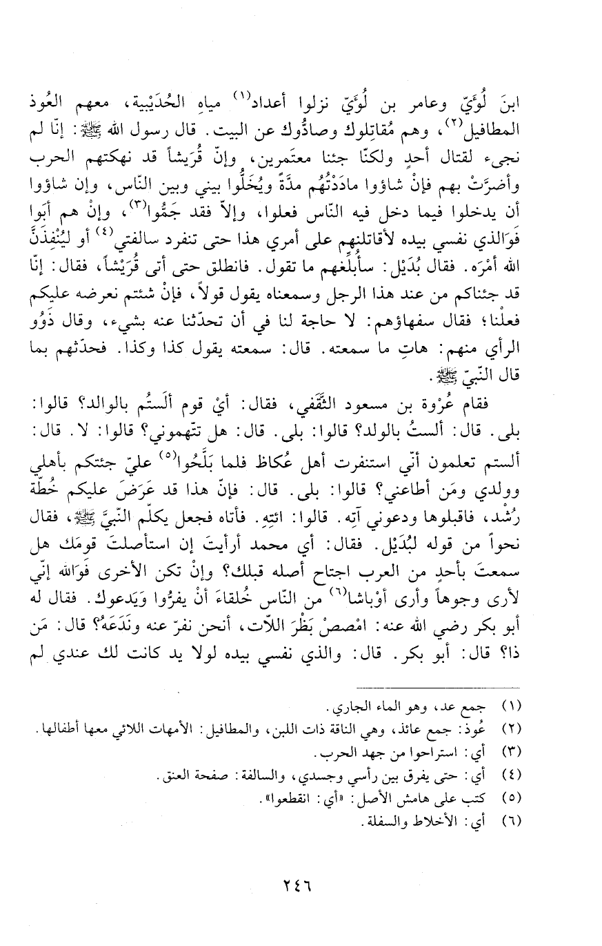 فقام عُرْوة بْن مَسْعُود الثَّقَفي فقال: أي قوم أَلَسْتُم بالوالد؟ قالوا: بلى. قال: ألست بالولد؟ قَالُوا: بلى. قَالَ: هَلْ تتّهموني؟ قَالُوا: لا. قَالَ: ألستم تعلمون أنّي استنفرت أهل عُكاظ فلما بلّحُوا عليّ جئتكم بأهلي وولدي ومن أطاعني؟ قَالُوا: بلى. قَالَ: فإنّ هذا قد عرض عليكم خطة رشد، فاقبلوها ودعوني آته. قالوا: ائته. فأتاه فجعل يكلّم النَّبِيّ - صَلَّى اللَّهُ عَلَيْهِ وَسَلَّمَ -، فقال نحوًا من قوله لبُدَيْلٍ. فقال: أي مُحَمَّد أرأيت إنْ استأصلت قومَك هَلْ سَمِعْتُ بأحدٍ من العرب اجتاح أصله قبلك؟ وإنْ تكن الأخرى فَوَالله إني لأرى وجوها وأرى أوباشا من الناس خلقاء أن يفرّوا وَيَدعوك. فقال لَهُ أَبُو بَكْر - رَضِيَ الله عَنْهُ -: أَمْصَصْ بَظْرَ الّلات. أنحن نفرّ عَنْهُ ونَدَعُهُ؟ قَالَ: من ذا؟ قَالَ: أَبُو بَكْر. قَالَ: والذي نفسي بيده لولا يد كانت لك عندي لم