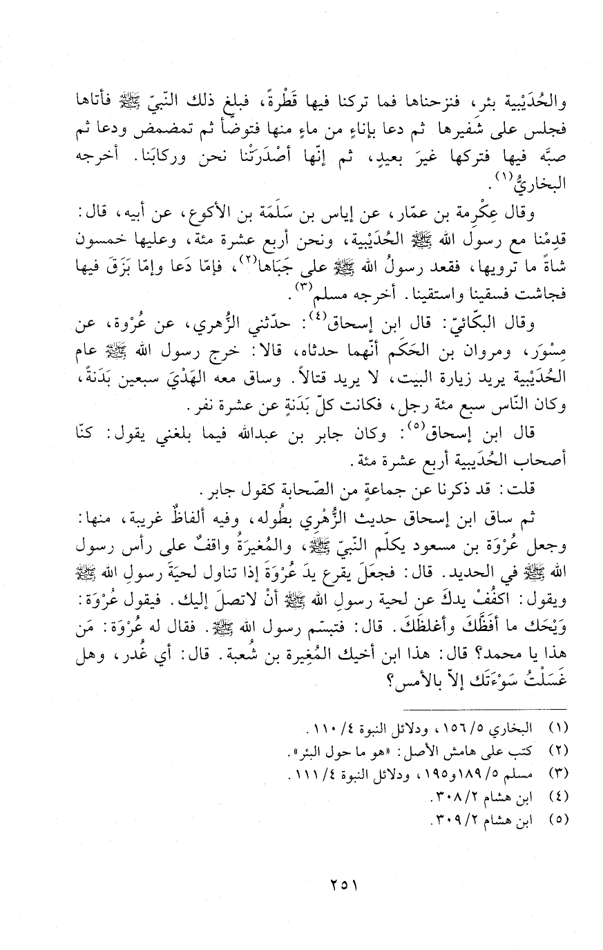 ثُمَّ ساق ابن إِسْحَاق حديث الزُّهري بطُوله، وفيه ألفاظٌ غريبة، منها: وجعل عُرْوَة بن مَسْعُود يكلّم النَّبِيّ - صَلَّى اللَّهُ عَلَيْهِ وَسَلَّمَ -، والمُغيرَةُ واقفٌ على رَأْسِ رَسُول اللَّهِ - صَلَّى اللَّهُ عَلَيْهِ وَسَلَّمَ - فِي الحديد. قال: فجعل يقرع يد عُرْوَةَ إذا تناول لحيَةَ رَسُول اللَّهِ - صَلَّى اللَّهُ عَلَيْهِ وَسَلَّمَ - ويقول: أكفُفْ يدك عَنْ لحية رَسُول اللَّهِ - صَلَّى اللَّهُ عَلَيْهِ وَسَلَّمَ - إِنَّ لَا تصل إليك. فيقول عُرْوَة: وَيْحك ما أفَظَّكَ وأغلظَكَ. قَالَ: فَتَبَسَّمَ رَسُول اللَّهِ - صَلَّى اللَّهُ عَلَيْهِ وَسَلَّمَ -. فَقَالَ له عُرْوَة: من هذا يا مُحَمَّد؟ قَالَ: هذا ابن أخيك المُغِيرة بْن شُعبة. قَالَ: أي غدر، وهل غَسَلْتَ سَوْءَتَك إلّا بالأمس؟.