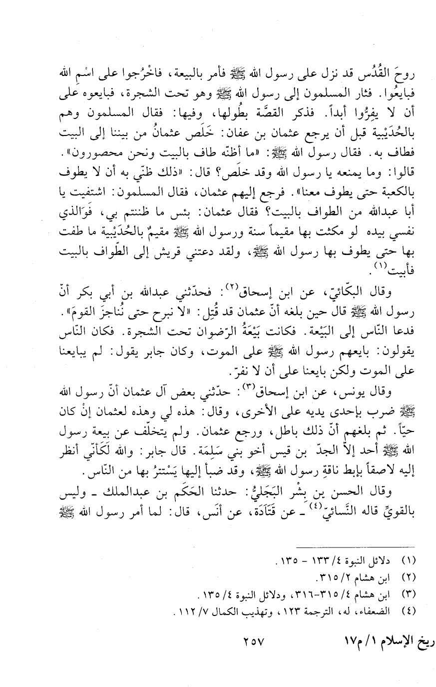 روح الْقُدُسَ قَدْ نَزَلَ عَلَى رَسُولِ اللَّهِ - صَلَّى اللَّهُ عَلَيْهِ وَسَلَّمَ - فَأَمَرَ بِالْبَيْعَةِ، فاخْرُجوا عَلَى اسْمِ اللَّهِ فَبَايِعُوا، فَثَارَ الْمُسْلِمُونَ إِلَى رَسُولِ اللَّهِ - صَلَّى اللَّهُ عَلَيْهِ وَسَلَّمَ - وَهُوَ تَحْتِ الشَّجْرَةِ، فَبَايَعُوهُ عَلَى أَنْ لا يَفِرُّوا أَبَدًا. فَذَكَرَ الْقِصَّةَ بِطُولِهَا، وَفِيهَا: فَقَالَ الْمُسْلِمُونَ - وَهُمْ بِالْحُدَيْبِيَةِ قَبْلَ أَنْ يَرْجِعَ عُثْمَانُ بْنُ عَفَّانَ -: خَلَصَ عُثْمَانُ مِنْ بَيْنِنَا إِلَى الْبَيْتِ فَطَافَ بِهِ. فَقَالَ رَسُولُ اللَّهِ - صَلَّى اللَّهُ عَلَيْهِ وَسَلَّمَ -: " مَا أَظُنُّهُ طَافَ بِالْبَيْتِ وَنَحْنُ مَحْصُورُونَ ". قَالُوا: وَمَا يَمْنَعُهُ يَا رَسُولَ اللَّهِ وَقَدْ خَلَصَ؟ قَالَ: " ذَلِكَ ظَنِّي بِهِ أَنْ لا يَطُوفَ بِالْكَعْبَةِ حَتَّى يَطُوفَ مَعَنَا ". فَرَجَعَ إِلَيْهِمْ عُثْمَانُ، فَقَالَ الْمُسْلِمُونَ: اشْتَفَيْتَ يَا أَبَا عَبْدِ الله من الطواف بالبيت؟ فقال عثمان: بِئْسَ مَا ظَنَنْتُمْ بِي، فَوَالَّذِي نَفْسِي بِيَدِهِ لَوْ مَكَثْتُ بِهَا مُقِيمًا سَنَةً وَرَسُولُ اللَّهِ - صَلَّى اللَّهُ عَلَيْهِ وَسَلَّمَ - مُقِيمٌ بِالْحُدَيْبِيَةِ مَا طُفْتُ بِهَا حَتَّى يَطُوفَ بِهَا رَسُولُ اللَّهِ - صَلَّى اللَّهُ عَلَيْهِ وَسَلَّمَ -، وَلَقْد دَعَتْنِي قُرَيْشٌ إِلَى الطَّوَافِ بِالْبَيْتِ فَأَبَيْتُ.