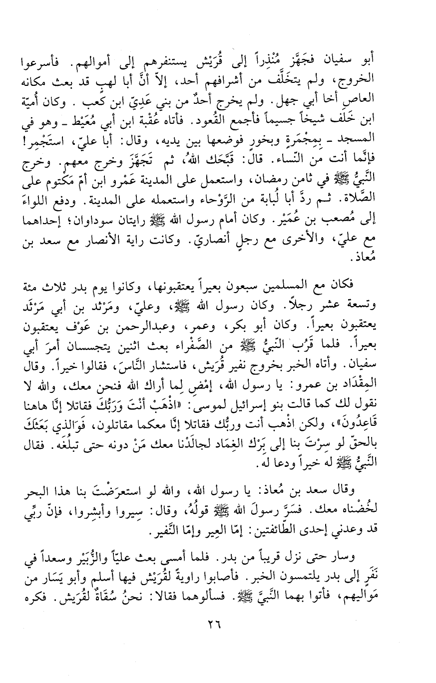وَسَارَ حَتَّى نَزَلَ قَرِيبًا مِنْ بَدْرٍ. فَلَمَّا أَمْسَى بَعَثَ عَلِيًّا وَالزُّبَيْرَ وَسَعْدًا فِي نَفَرٍ إِلَى بَدْرٍ يَلْتَمِسُونَ الْخَبَرَ. فَأَصَابُوا رَاوِيَةً لِقُرَيْشٍ فِيهَا أَسْلَمُ وَأَبُو يَسَارٍ مِنْ مَوَالِيهِمْ، فَأَتَوْا بِهِمَا النَّبِيَّ - صَلَّى اللَّهُ عَلَيْهِ وَسَلَّمَ - فَسَأَلُوهُمَا فَقَالَا: نَحْنُ سُقَاةٌ لِقُرَيْشٍ. فَكَرِهَ