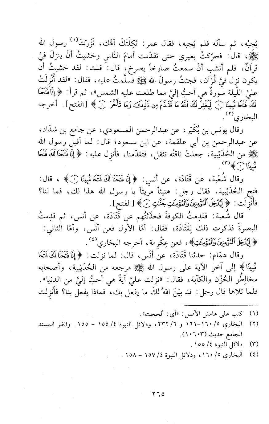 يُجِبْهُ، ثُمَّ سَأَلَهُ فَلَمْ يُجِبْهُ، فَقَالَ عُمَرُ: ثَكِلَتْكَ أُمُّكَ، نَزَرْتَ رَسُولَ اللَّهِ - صَلَّى اللَّهُ عَلَيْهِ وَسَلَّمَ -، قَالَ: فَحَرَّكْتُ بَعِيرِي حَتَّى تَقَدَّمَتْ أَمَامَ النَّاسِ وَخَشِيتُ أَنْ يَنْزِلَ فيَّ قُرْآنٌ، فَلَمْ أَنْشَبْ أَنْ سَمِعْتُ صَارِخًا يَصْرُخُ، قَالَ: قُلْتُ: لَقَدْ خَشِيتُ أَنْ يَكُونَ نَزَلَ فِيَّ قُرْآنٌ، فَجِئْتُ رَسُولَ اللَّهِ - صَلَّى اللَّهُ عَلَيْهِ وسلم - فسلمت عليه، فقال: " لقد أنزلت علي الليلة سورة هي أحب إلي مما طلعت عليه الشمس "، ثُمَّ قَرَأَ: " إِنَّا فَتَحْنَا لَكَ فَتْحًا مُبِينًا لِيَغْفِرَ لَكَ اللَّهُ مَا تَقَدَّمَ مِنْ ذَنْبِكَ وَمَا تَأَخَّرَ ". أَخْرَجَهُ الْبُخَارِيُّ.