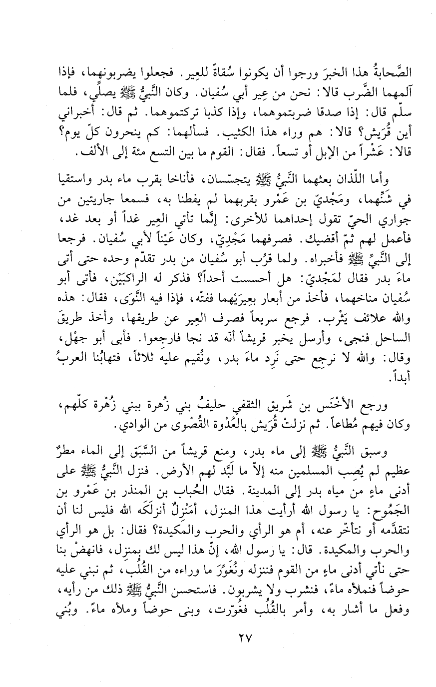 الصَّحَابَةُ هَذَا الْخَبَرَ، وَرَجَوْا أَنْ يَكُونُوا سُقَاةً لِلْعِيرِ. فَجَعَلُوا يَضْرِبُونَهُمَا، فَإِذَا آلَمَهُمَا الضَّرْبُ قَالَا: نَحْنَ مِنْ عِيرِ أَبِي سُفْيَانَ. وَكَانَ النَّبِيُّ - صَلَّى اللَّهُ عَلَيْهِ وَسَلَّمَ - يُصَلِّي، فَلَمَّا سَلَّمَ قَالَ: إِذَا صَدَقَا ضَرَبْتُمُوهُمَا، وَإِذَا كَذَبَا تَرَكْتُمُوهُمَا. ثُمَّ قَالَ: أَخْبِرَانِي أَيْنَ قُرَيْشٌ؟ قَالَا: هُمْ وَرَاءَ هَذَا الْكَثِيبِ. فَسَأَلَهُمَا: كَمْ يَنْحَرُونَ كُلَّ يَوْمٍ؟ قَالَا: عَشْرًا مِنَ الْإِبِلِ أَوْ تِسْعًا: فَقَالَ: الْقَوْمُ مَا بَيْنَ التِّسْعُمَائَةِ إِلَى الْأَلْفِ.