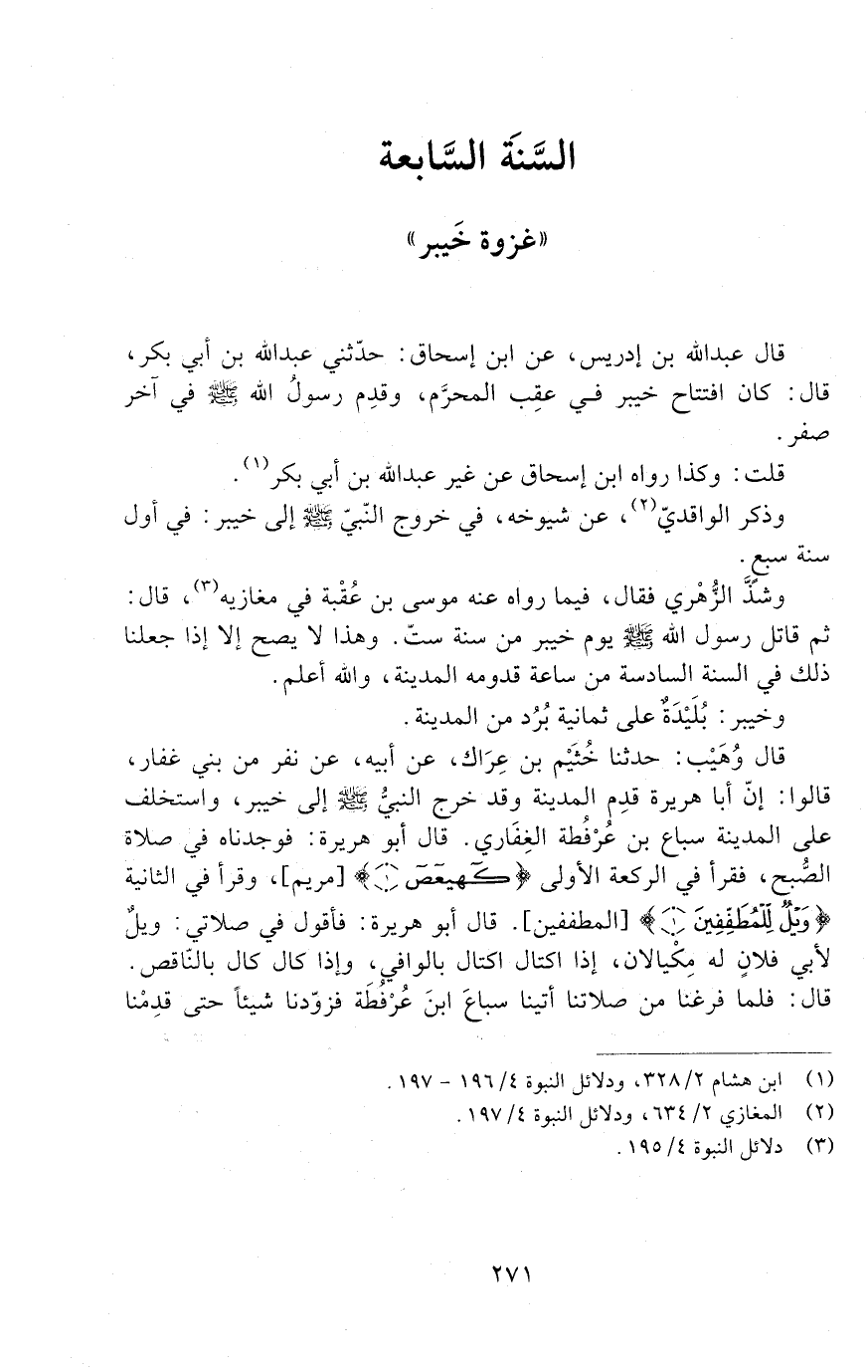 وذكر الواقديّ، عَنْ شيوخه، فِي خروج النَّبِيّ صَلَّى اللَّهُ عَلَيْهِ وَسَلَّمَ إلى خيبر: فِي أول سنة سبعٍ.