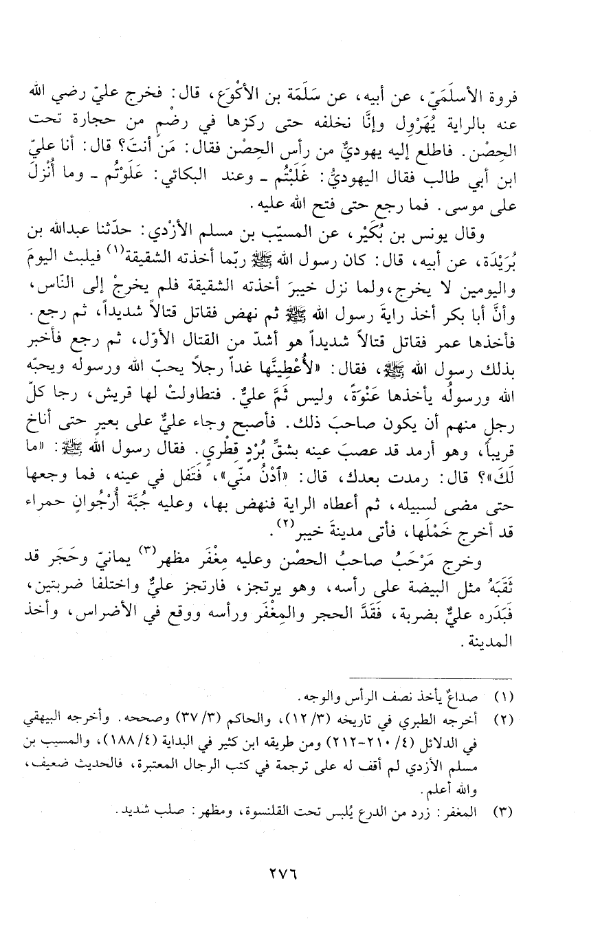 فَروة الأسلميّ، عَنْ أَبِيهِ، عَنْ سَلَمَةَ بْنِ الأَكْوَعِ قَالَ: فخرج عليّ رَضِيَ الله عَنْهُ بالراية يهرول وإنا نخلفه حتى ركّزها فِي رضْمٍ من حجارة تحت الحصن. فاطلع إليه يهودي من رأس الحصن فقال: من أنت؟ قَالَ: أَنَا عليّ بْن أبي طالب فقال اليهودي: غلبتم - وعند البكائي: علوتم - وما أُنْزل عَلَى موسى. فما رجع حتى فتح الله عَلَيْهِ.