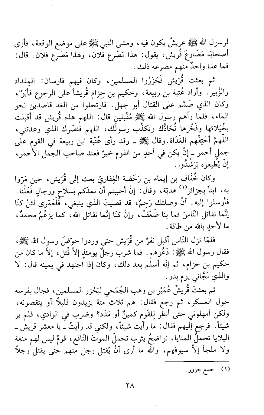 ثُمَّ بَعَثَتْ قُرَيْشٌ عُمَيْرَ بْنَ وَهْبٍ الْجُمَحِيَّ لِيَحْزَرَ الْمُسْلِمِينَ. فَجَالَ بِفَرَسِهِ حَوْلَ الْعَسْكَرِ، ثُمَّ رَجَعَ فَقَالَ: هُمْ ثَلَاثُمَائَةٍ يَزِيدُونَ قَلِيلًا أَوْ يَنْقُصُونَهُ، وَلَكِنْ أَمْهِلُونِي حَتَّى أَنْظُرَ لِلْقَوْمِ كَمِينٌ أَوْ مَدَدٌ؟ وَضَرَبَ فِي الْوَادِي، فَلَمْ يَرَ شَيْئًا فَرَجَعَ إِلَيْهِمْ فقال: ما رأيت شيئا، ولكني قَدْ رَأَيْتُ - يَا مَعْشَرَ قُرَيْشٍ - الْبَلَايَا تَحْمِلُ الْمَنَايَا، نَوَاضِحُ يَثْرِبَ تَحْمِلُ الْمَوْتَ النَّاقِعَ. قَوْمٌ لَيْسَ لَهُمْ مَنَعَةٌ وَلَا مَلْجَأٌ إِلَّا سُيُوفُهُمْ، وَاللَّهِ مَا أَرَى أَنْ يُقْتَلَ رَجُلٌ مِنْهُمْ حَتَّى يَقْتُلَ رَجُلًا