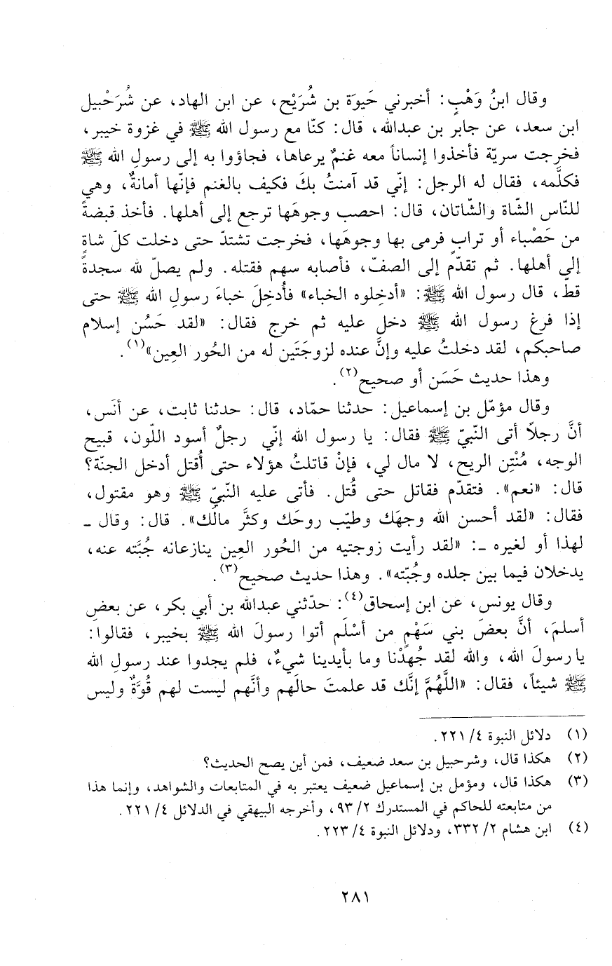وَقَالَ ابْنُ وَهْبٍ: أَخْبَرَنِي حَيوَةُ بْنُ شُرَيْحٍ، عَنِ ابْنِ الْهَادِ، عَنْ شُرَحْبِيلَ بْنِ سَعْدٍ، عَنْ جَابِرِ بْنِ عَبْدِ اللَّهِ قَالَ: كُنَّا مَعَ رَسُولِ اللَّهِ صَلَّى اللَّهُ عَلَيْهِ وَسَلَّمَ فِي غَزْوَةِ خَيْبَرَ، فَخَرَجَتْ سَرِيَّةٌ فَأَخَذُوا إِنْسَانًا معه غنم يرعاها، فجاؤوا بِهِ إِلَى رَسُولِ اللَّهِ صَلَّى اللَّهُ عَلَيْهِ وَسَلَّمَ فَكَلَّمَهُ، فَقَالَ لَهُ الرَّجُلُ: إِنِّي قَدْ آمنت بك، فَكَيْفَ بِالْغَنَمِ فَإِنَّهَا أَمَانَةٌ، وَهِيَ لِلنَّاسِ الشَّاةُ والشاتان، قَالَ: احْصِبْ وُجُوهَهَا تَرْجِعْ إِلَى أَهْلِهَا. فَأَخَذَ قبضة من حصباء أو تراب فرمى بها وجوهها، فَخَرَجَتْ تَشْتَدُّ حَتَّى دَخَلَتْ كُلُّ شَاةٍ إِلَى أَهْلِهَا. ثُمَّ تَقَدَّمَ إِلَى الصَّفِّ، فَأَصَابَهُ سَهْمٌ فَقَتَلَهُ. وَلَمْ يُصَلِّ لِلَّهِ سَجْدَةً قَطُّ، قَالَ رَسُولُ اللَّهِ صَلَّى اللَّهُ عَلَيْهِ وَسَلَّمَ: " أدخلوه الخباء " فأدخل خباء رَسُول اللَّهِ صَلَّى اللَّهُ عَلَيْهِ وَسَلَّمَ حَتَّى إِذَا فَرَغَ رَسُول اللَّهِ صَلَّى اللَّهُ عَلَيْهِ وَسَلَّمَ دَخَلَ عَلَيْهِ ثُمَّ خَرَجَ فَقَالَ: " لَقْد حَسُنَ إِسْلامُ صَاحِبِكُمْ، لَقَدْ دَخَلْتُ عَلَيْهِ وَإِنَّ عِنْدَهُ لَزَوْجَتَيْنِ لَهُ مِنَ الْحُورِ الْعِينِ ".