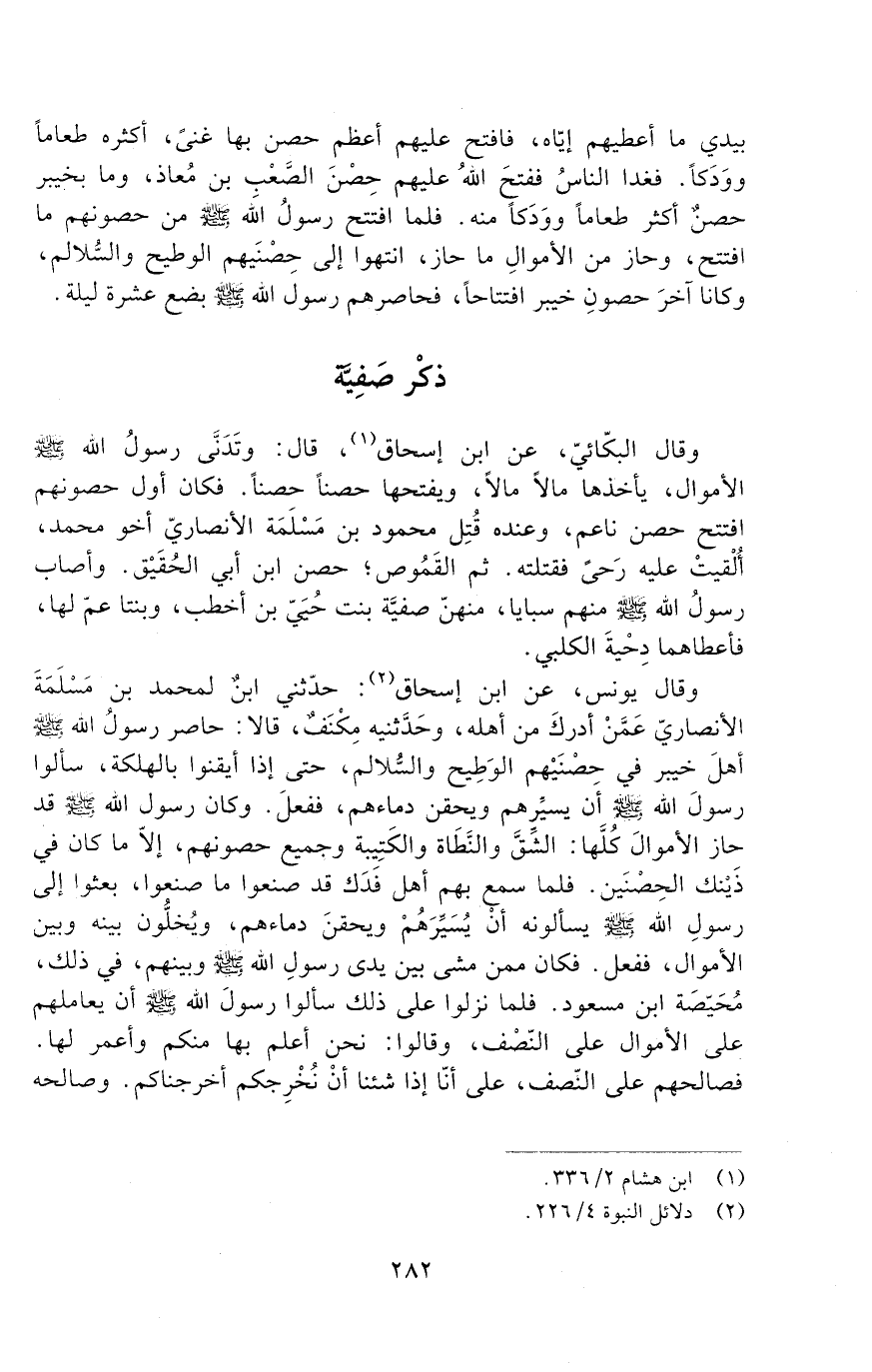 وقال البكّائي، عن ابن إسحاق قال: وتدنى رَسُول اللَّهِ صَلَّى اللَّهُ عَلَيْهِ وَسَلَّمَ الأموال، يأخذها مالًا مالًا، ويفتحها حصنًا حصنًا. فكان أول حصونهم افتتح حصن ناعم، وعنده قُتِل محمود بْن مَسْلَمَة الأنصاريّ أخو مُحَمَّد، ألقيت عَلَيْهِ رَحَى فقتلته. ثُمَّ القَمُوص؛ حصن ابن أَبِي الحُقَيْق. وأصاب رَسُول اللَّهِ صَلَّى اللَّهُ عَلَيْهِ وَسَلَّمَ منهم سبايا، منهنّ صفيَّة بِنْت حُيَيّ بْن أخطب، وبنتا عمّ لَهَا، فأعطاهما دِحْيةَ الكلبي.