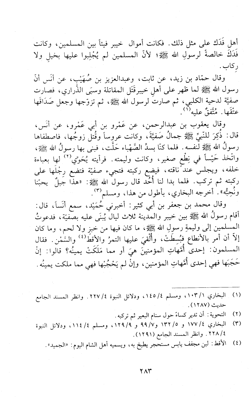 وَقَالَ يَعْقُوبُ بْنُ عَبْدِ الرَّحْمَنِ، عَنْ عَمْرِو بْنِ أَبِي عَمْرٍو، عَنْ أَنَسٍ، قَالَ: ذُكِرَ لِلنَّبِيِّ صَلَّى اللَّهُ عَلَيْهِ وَسَلَّمَ جَمَالُ صَفِيَّةَ، وَكَانَتْ عَرُوسًا وَقُتِلَ زَوْجُهَا، فَاصْطَفَاهَا رَسُولُ اللَّهِ صَلَّى اللَّهُ عَلَيْهِ وَسَلَّمَ لِنَفْسِهِ. فَلَمَّا كُنَّا بِسَدِّ الصَّهْبَاءِ حَلَّتْ، فَبَنَى بِهَا رَسُولُ اللَّهِ صَلَّى اللَّهُ عَلَيْهِ وَسَلَّمَ: وَاتَّخَذَ حَيْسًا فِي نِطْعٍ صَغِيرٍ، وَكَانَتْ وَلِيمَتَهُ. فَرَأَيْتُهُ يُحَوِّي لَهَا بِعَبَاءَةٍ خَلْفَهُ، وَيَجْلِسُ عِنْدَ نَاقَتِهِ، فَيَضَعُ رُكْبَتَهُ فَتَجِيءُ صَفِيَّةُ فَتَضَعُ رِجْلَهَا عَلَى رُكْبَتِهِ ثُمَّ تَرْكَبُ. فَلَمَّا بَدَا لَنَا أُحد قَالَ رَسُول اللَّهِ صَلَّى اللَّهُ عَلَيْهِ وَسَلَّمَ: " هَذَا جَبَلٌ يُحِبُّنَا وَنُحِبُّهُ ". أَخْرَجَهُ الْبُخَارِيُّ، بِأَطْوَلَ مِنْ هَذَا، وَمُسْلِمٌ.