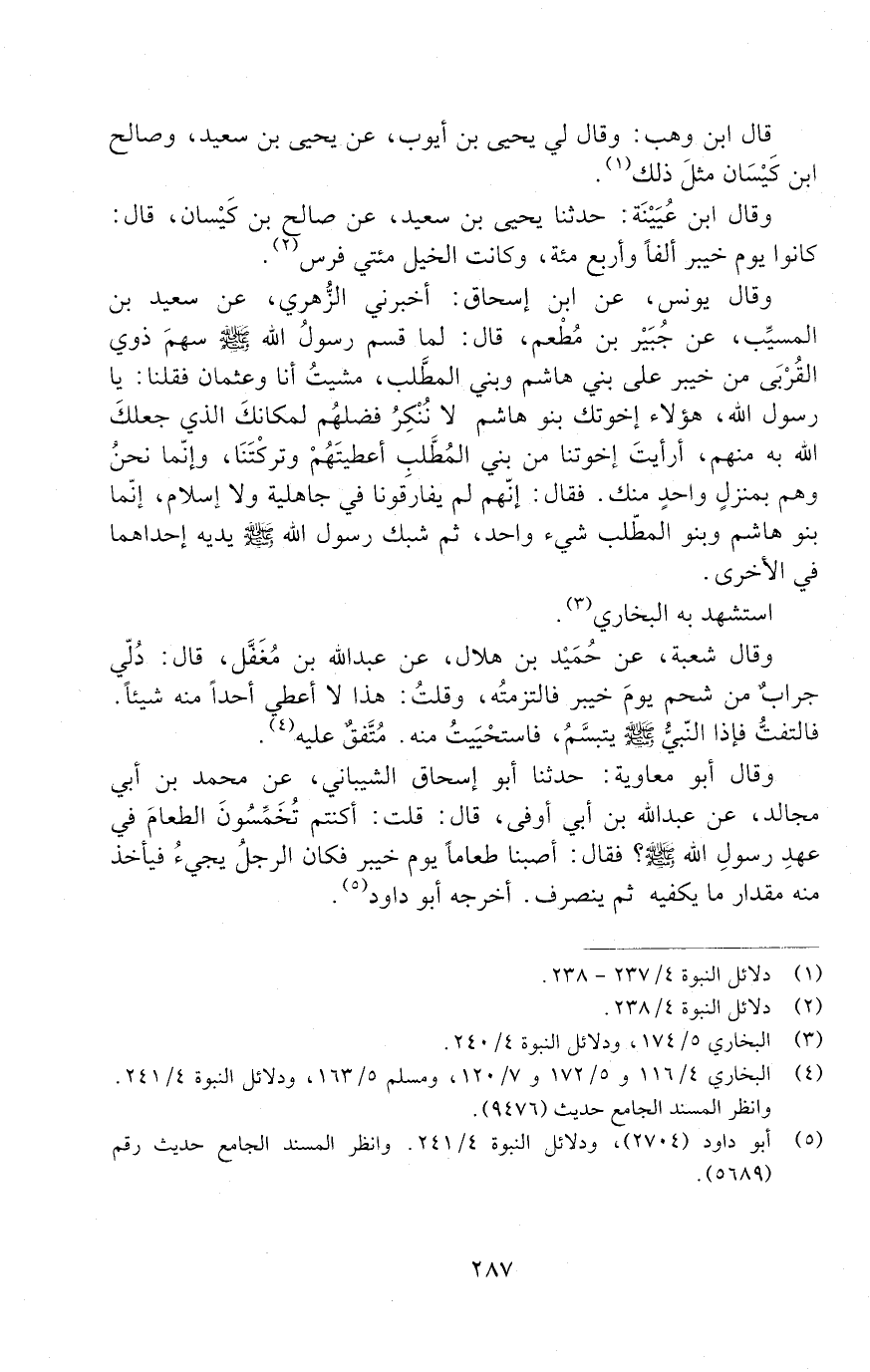 وَقَالَ يُونُسُ، عَنِ ابْنِ إِسْحَاقَ، أَخْبَرَنِي الزُّهْرِيُّ، عَنْ سَعِيدِ بْنِ الْمُسَيِّبِ، عَنْ جُبَيْرِ بْنِ مُطْعِمٍ قَالَ: لَمَّا قَسَّمَ رَسُولُ اللَّهِ صَلَّى اللَّهُ عَلَيْهِ وَسَلَّمَ سَهْمَ ذَوِي الْقُرْبَى مِنْ خَيْبَرَ عَلَى بَنِي هَاشِمٍ وَبَنِي الْمُطَّلِبِ، مَشَيْتُ أَنَا وَعُثْمَانُ فَقُلْنَا: يَا رَسُولَ اللَّهِ، هَؤُلاءِ إِخْوَتُكَ بَنُو هَاشِمٍ لا ننكر فَضْلُهُمْ لِمَكَانِكَ الَّذِي جَعَلَكَ اللَّهُ بِهِ مِنْهُمْ. أرأيت إخوتنا مِنْ بَنِي الْمُطَّلِبِ أَعْطَيْتَهُمْ وَتَرَكْتَنَا، وَإِنَّمَا نَحْنُ وهم بمنزل واحد مِنْكَ. فَقَالَ: إِنَّهُمْ لَمْ يُفَارِقُونَا فِي جَاهِلِيَّةٍ ولا إسلام، إنّما بَنُو هَاشِمٍ وَبَنُو الْمُطَّلِبِ شَيْءٌ وَاحِدٌ، ثُمَّ شَبَّكَ رَسُولُ اللَّهِ صَلَّى اللَّهُ عَلَيْهِ وَسَلَّمَ يديه إحداهما في الأخرى.
