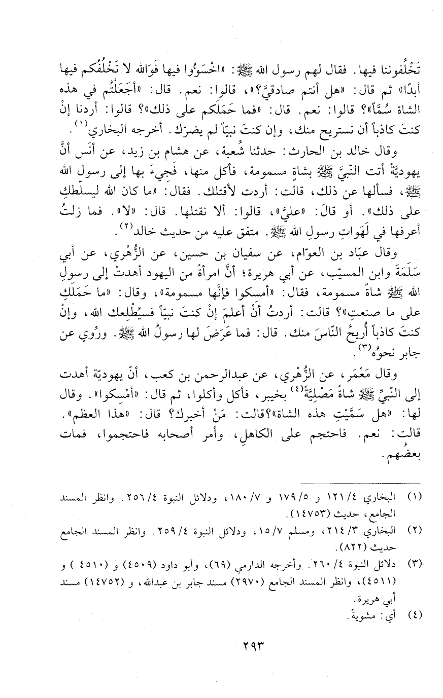 وقال خالد بن الحارث: حدثنا شُعْبَةُ، عَنْ هِشَامِ بْنِ زَيْدٍ، عَنْ أَنَسٍ أَنَّ يَهُودِيَّةَ أَتَتْ النَّبِيَّ صَلَّى اللَّهُ عَلَيْهِ وَسَلَّمَ بِشَاةٍ مَسْمُومَةٍ، فَأَكَلَ مِنْهَا، فَجِيءَ بِهَا إِلَى رَسُولِ اللَّهِ صَلَّى اللَّهُ عَلَيْهِ وَسَلَّمَ، فَسَأَلَهَا عَنْ ذَلِكَ، قَالَتْ: أَرَدْتُ لِأَقْتُلَكَ. فَقَالَ: " مَا كَانَ اللَّهُ لِيُسَلِّطَكِ عَلَى ذَلِكَ ". أَوْ قَالَ: " عَلَيَّ "، قَالُوا: أَلَا نَقْتُلُهَا. قَالَ: " لَا ". فَمَا زِلْتُ أَعْرِفُهَا فِي لَهَوَاتِ رَسُولِ اللَّهِ صَلَّى اللَّهُ عَلَيْهِ وَسَلَّمَ. مُتَّفَقٌ عليه من حَدِيثِ خَالِدٍ.