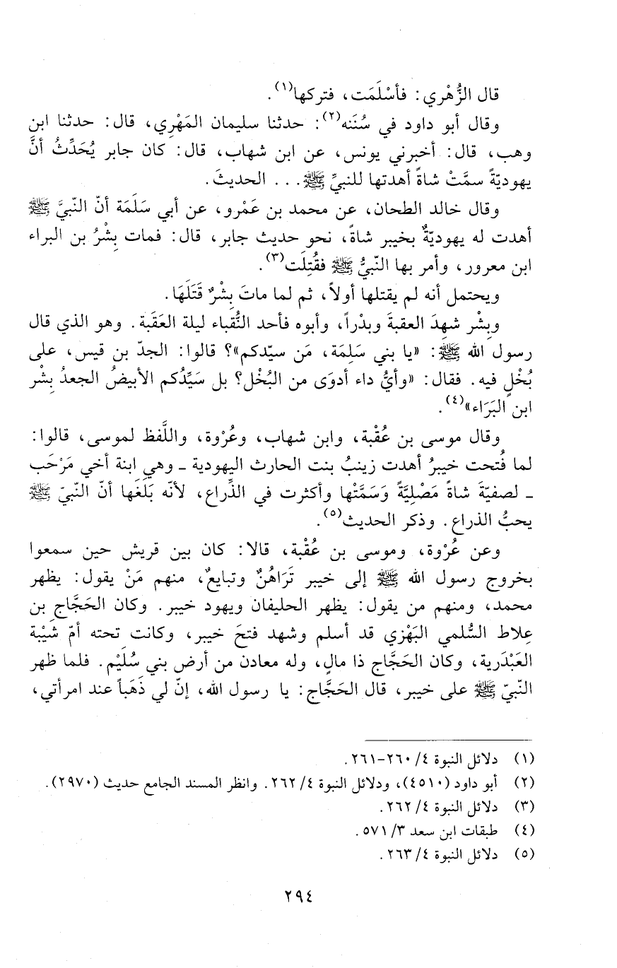 وقال موسى بْن عُقْبة، وابن شهاب، وعُرْوة، والَّلفظ لموسى قَالُوا: لما فُتحت خيبر أهدت زينبُ بِنْت الحارث اليهودية - وهي ابْنَة أخي مَرْحَب - لصفية شاةً مَصْلِيَّةً وَسَمَّتْها وأكثرت فِي الذَّراع، لأنّه بَلَغَها أنّ النَّبِيّ صَلَّى اللَّهُ عَلَيْهِ وَسَلَّمَ يحبّ الذراع. وذكر الحديث.