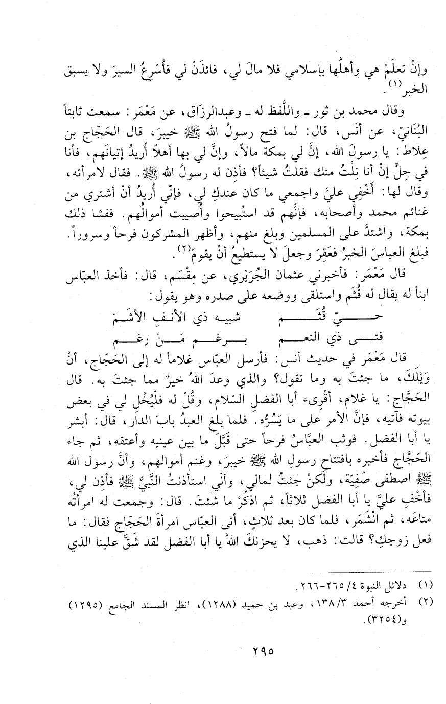 قَالَ مَعْمَرٌ فِي حَدِيثِ أَنَسٍ: فَأَرْسَلَ الْعَبَّاسُ غُلامًا لَهُ إِلَى الْحَجَّاجِ أَنْ: وَيْلَكَ، مَا جِئْتَ بِهِ وَمَا تَقُولُ؟ وَالَّذِي وَعَدَ اللَّهُ خَيْرٌ مِمَّا جِئْتَ بِهِ. قَالَ الْحَجَّاجُ: يَا غُلامُ أَقْرِئْ أَبَا الْفَضْلِ السَّلامَ، وَقُلْ لَهُ: فَلْيُخْلِ لِي فِي بَعْضِ بُيُوتِهِ فَآتِيهِ، فَإِنَّ الأَمْرَ عَلَى مَا يَسُرُّهُ. فَلَمَّا بَلَغَ الْعَبْدُ بَابَ الدَّارِ، قَالَ: أَبْشِرْ يَا أَبَا الْفَضْلِ. فَوَثَبَ الْعَبَّاسُ فَرَحًا حَتَّى قَبَّلَ مَا بَيْنَ عَيْنَيْهِ وَأَعْتَقَهُ، ثُمَّ جَاءَ الْحَجَّاجُ فَأَخْبَرَهُ بِافْتِتَاحِ رَسُولِ اللَّهِ صَلَّى اللَّهُ عَلَيْهِ وَسَلَّمَ خَيْبَرَ، وَغَنْمِ أَمْوَالِهِمْ، وَأَنَّ رَسُولَ اللَّهِ صَلَّى اللَّهُ عَلَيْهِ وَسَلَّمَ اصطفى صفية، ولكن جئت لمالي، وأني استأذنت النبي صلى الله عليه وسلم فأذن لي، فأخف عَلَيَّ يَا أَبَا الْفَضْلِ ثَلاثًا، ثُمَّ اذْكُرْ مَا شِئْتَ. قَالَ: وَجَمَعَتْ لَهُ امْرَأَتُهُ مَتَاعَهُ، ثم انشمر، فَلَمَّا كَانَ بَعْدَ ثَلاثٍ، أَتَى الْعَبَّاسُ امْرَأَةَ الْحَجَّاجِ فَقَالَ: مَا فَعَلَ زَوْجُكِ؟ قَالَتْ: ذَهَبَ، لا يُحْزِنُكَ اللَّهُ يَا أَبَا الْفَضْلِ لَقَدْ شَقَّ عَلَيْنَا الَّذِي
