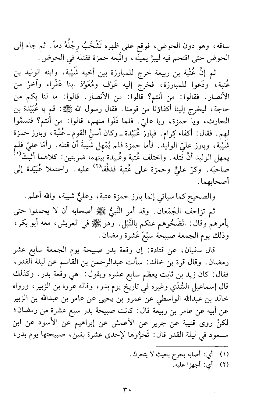 ثُمَّ إِنَّ عُتْبَةَ بْنَ رَبِيعَةَ خَرَجَ لِلْمُبَارَزَةِ بَيْنَ أَخِيهِ شَيْبَةَ، وَابْنِهِ الْوَلِيدِ بْنِ عُتْبَةَ، وَدَعَوْا لِلْمُبَارَزَةِ، فَخَرَجَ إِلَيْهِ عَوْفٌ وَمُعَوَّذٌ ابْنَا عَفْرَاءَ وَآخَرُ مِنَ الْأَنْصَارِ. فَقَالُوا: مَنْ أَنْتُمْ؟ قَالُوا: مِنَ الْأَنْصَارِ. قَالُوا: مَا لَنَا بِكُمْ مِنْ حَاجَةٍ، لِيَخْرُجْ إِلَيْنَا أَكَفَّاؤُنَا مِنْ قَوْمِنَا. فَقَالَ رَسُولُ اللَّهِ - صَلَّى اللَّهُ عَلَيْهِ وَسَلَّمَ -: قُمْ يَا عُبَيْدَةُ بْنَ الْحَارِثِ، وَيَا حَمْزَةُ، وَيَا عَلِيُّ. فَلَمَّا دَنَوْا مِنْهُمْ، قَالُوا: مَنْ أَنْتُمْ؟ فَتَسَمَّوْا لَهُمْ. فَقَالَ: أَكْفَاءٌ كِرَامٌ. فَبَارَزَ عُبَيْدَةُ - وَكَانَ أَسَنَّ الْقَوْمِ - عُتْبَةُ، وَبَارَزَ حَمْزَةُ شَيْبَةَ، وَبَارَزَ عَلِيٌّ الْوَلِيدَ. فَأَمَّا حَمْزَةُ فَلَمْ يُمْهِلْ شَيْبَةَ أَنْ قَتَلَهُ. وَأَمَّا عَلِيٌّ فَلَمْ يُمْهِلِ الْوَلِيدَ أَنْ قَتَلَهُ. وَاخْتَلَفَ عُتْبَةُ وَعُبَيْدَةُ بَيْنَهُمَا ضَرْبَتَيْنِ: كِلَاهُمَا أَثْبَتَ صَاحِبَهُ. وَكَرَّ عَلِيٌّ وَحَمْزَةُ عَلَى عُتْبَةَ فَدَفَّفَا عَلَيْهِ. وَاحْتَمَلَا عُبَيْدَةَ إِلَى أَصْحَابِهِمَا.