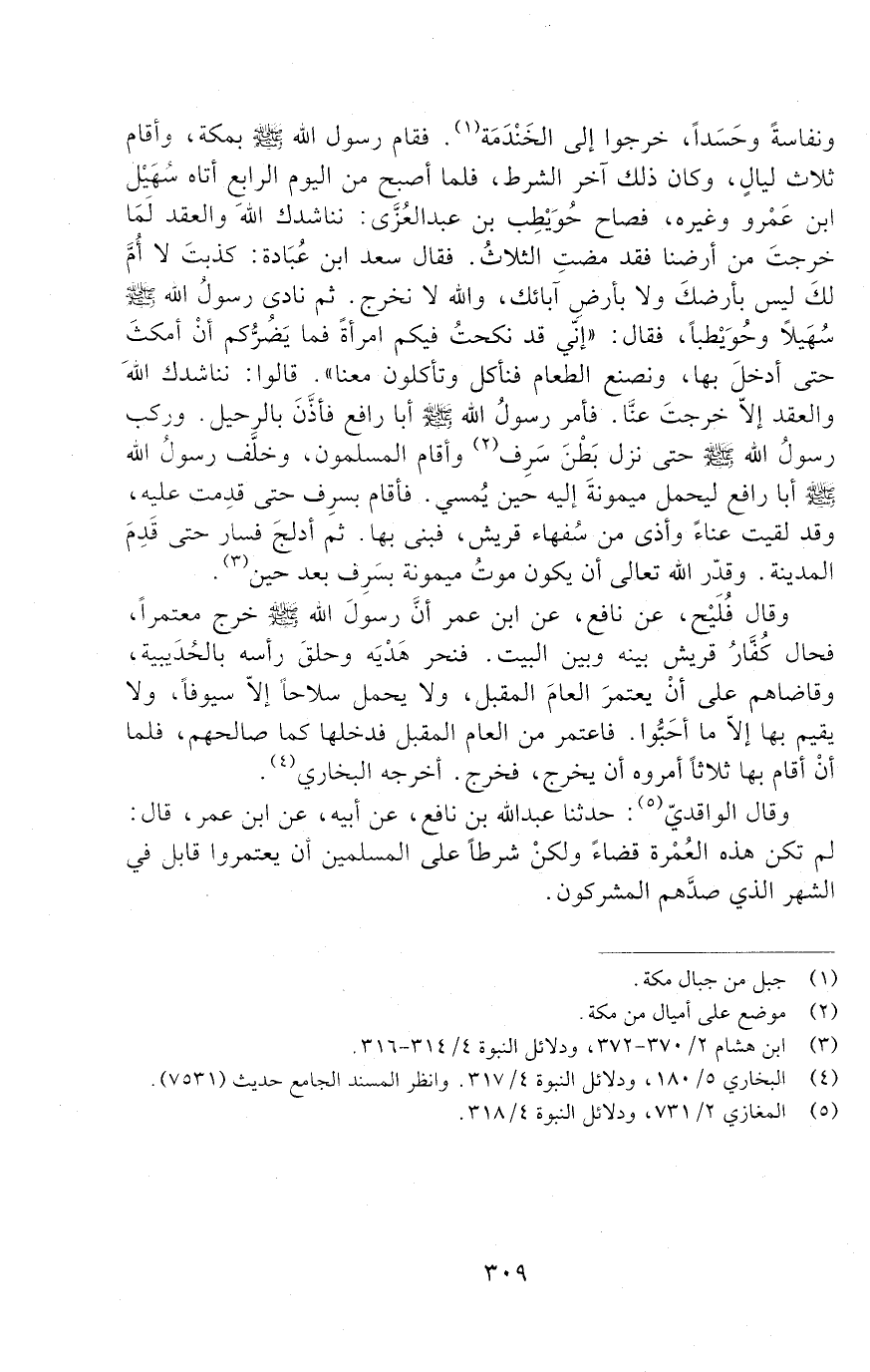 ونفاسة وحَسَدًا، خرجوا إلى الخَنْدَمَة. فَقَامَ رَسُول اللَّهِ صَلَّى اللَّهُ عَلَيْهِ وَسَلَّمَ بمكة، وأقام ثلاث ليالٍ، وكان ذَلِكَ آخر الشرط. فلما أصبح من اليوم الرابع أتاه سُهَيْلُ بْن عَمْرو وغيره، فصاح حُوَيْطِب بْن عَبْد العُزَّى: نناشدك الله والعقد لما خرجتَ من أرضنا فقد مضت الثلاث. فقال سعد ابن عُبَادة: كذبتَ لا أُمّ لك لَيْسَ بأرضك ولا بأرض آبائك، والله لا نخرج. ثُمَّ نادى رسول الله صلى الله عليه وسلم سُهَيلًا وحُوَيْطبًا، فقال: " إنّي قد نكحت فيكم امرأةً فما يضرّكم أن أمكث حتى أدخل بِهَا، ونصنع الطعام فنأكل وتأكلون معنا ". قَالُوا: نناشدك الله والعقد، إلا خرجت عنّا. فأمر رَسُول اللَّهِ صَلَّى اللَّهُ عَلَيْهِ وَسَلَّمَ أَبَا رافع فأذّن بالرحيل. وَرَكِبَ رَسُول اللَّهِ صَلَّى اللَّهُ عَلَيْهِ وَسَلَّمَ حَتَّى نزل بطن سَرِف وأقام المسلمون، وخلَّف رَسُول اللَّهِ صَلَّى اللَّهُ عَلَيْهِ وَسَلَّمَ أَبَا رافع ليحمل ميمونة إِلَيْهِ حين يُمسي. فأقام بسرِف حتى قدِمت عَلَيْهِ، وقد لقيت عناءً وأذى من سُفهاء قريش، فبنى بِهَا. ثُمَّ أدلج فسار حتى قدم المدينة. وقدر الله تعالى أن يكون موتُ ميمونة بسَرِف بعد حين.