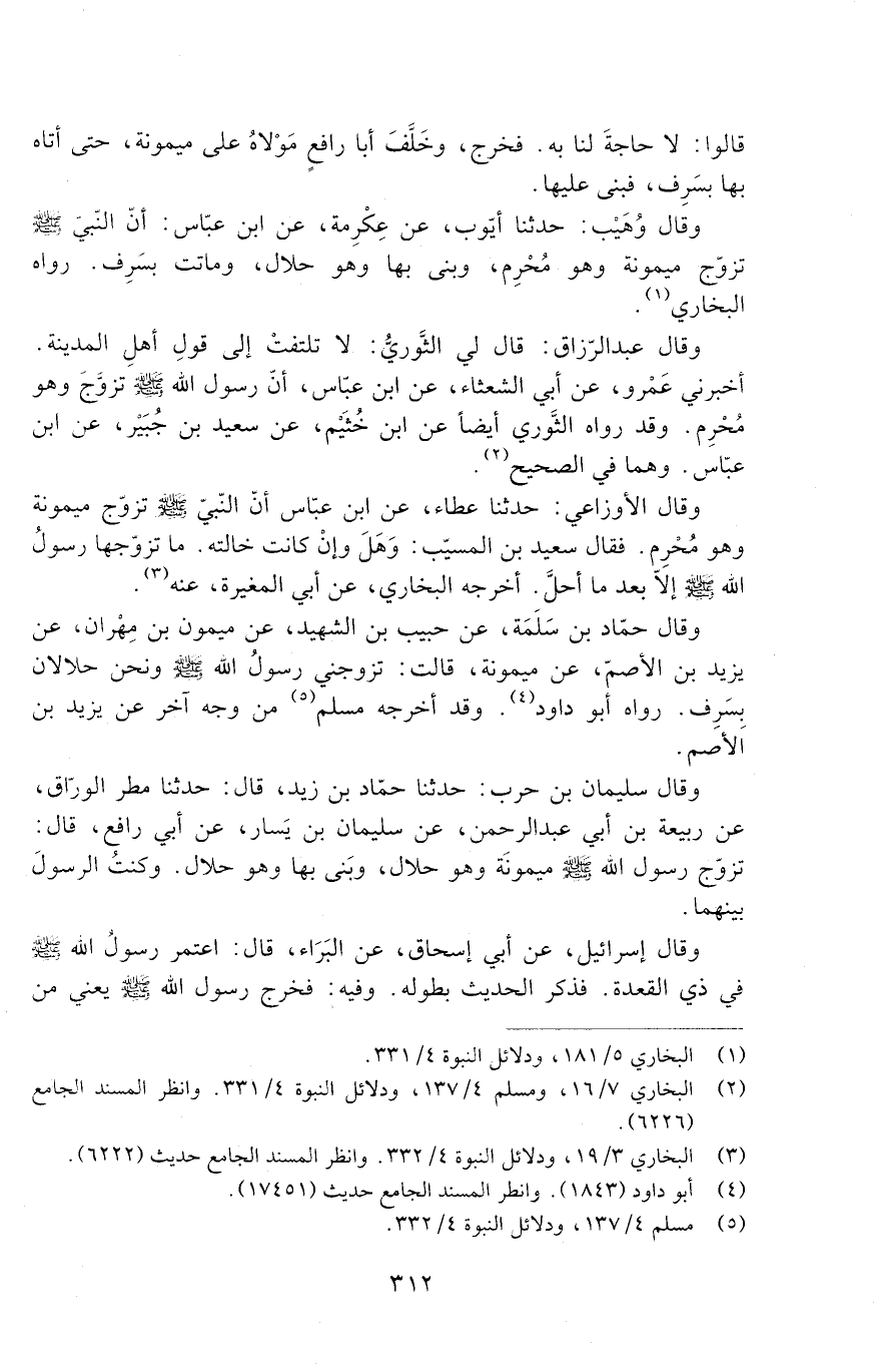 قَالُوا: لَا حَاجَةَ لَنَا بِهِ. فَخَرَجَ، وَخَلَّفَ أَبَا رَافِعٍ مَوْلَاهُ عَلَى مَيْمُونَةَ، حَتَّى أَتَاهُ بها بسرف، فبنى عليها.