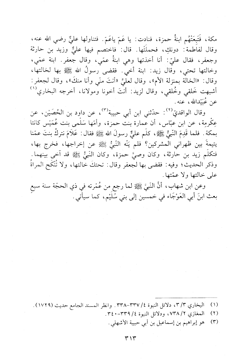 مَكَّةَ، فَتَبِعَتْهُمُ ابْنَةُ حَمْزَةَ، فَنَادَتْ: يَا عَمُّ يا عم. فتناولها علي رضي الله عنه، وقال لفاطمة: دونك، فحملتها. قال: فاختصم فيها عَلِيٌّ وَزَيْدُ بْنُ حَارِثَةَ وَجَعْفَرٌ، فَقَالَ عَلِيٌّ: أَنَا أَخَذْتَهَا وَهِيَ ابْنَةُ عَمِّي، وَقَالَ جَعْفَرٌ: ابْنَةُ عَمِّي، وَخَالَتُهَا تَحْتِي، وَقَالَ زَيْدٌ: ابْنَةُ أَخِي. فَقَضَى رَسُولُ اللَّهِ صَلَّى اللَّهُ عَلَيْهِ وَسَلَّمَ بِهَا لِخَالَتِهَا، وَقَالَ: " الْخَالَةُ بِمَنْزِلَةِ الْأُمِّ ". وَقَالَ لِعَلِيٍّ: " أَنْتَ مِنِّي وَأَنَا مِنْكَ "، وَقَالَ لِجَعْفَرٍ: أَشْبَهْتَ خُلُقِي وَخَلْقِي، وَقَالَ لِزَيْدٍ: أَنْتَ أَخُونَا وَمَوْلانَا، أَخْرَجَهُ الْبُخَارِيُّ عَنْ عُبَيْدِ اللَّهِ عنه.