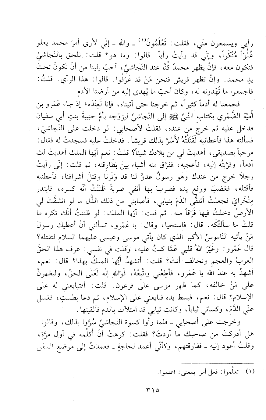 رأيي ويسمعون مني، فقلت: تعلمون وَاللَّهِ إِنِّي لأَرَى أَمْرَ مُحَمَّدٍ يَعْلُو عُلُوًّا مُنْكَرًا، وَإِنِّي قَدْ رَأَيْتُ رَأْيًا. قَالُوا: وَمَا هو؟ قلت: نلحق بالنجاشي فنكون معه، فإن يظهر محمد كنا عند النجاشي، أَحَبُّ إِلَيْنَا مِنْ أَنْ نَكُونَ تَحْتَ يَدِ محمد. وإن تظهر قريش فنحن من قد عَرَفُوا. قَالُوا: هَذَا الرَّأْيُ. قُلْتُ: فَاجْمَعُوا مَا تُهْدُونَهُ لَهُ. وَكَانَ أَحَبَّ مَا يُهْدَى إِلَيْهِ مِنْ أَرْضِنَا الأَدَمُ.