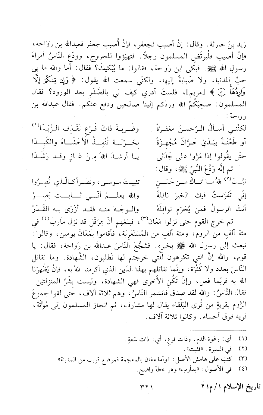 ثُمَّ خَرَجَ الْقَوْمُ حَتَّى نَزَلُوا مَعَانَ، فَبَلَغَهُمْ أَنَّ هِرَقْلَ قَدْ نزل مآرب فِي مِائَةِ أَلْفٍ مِنَ الرُّومِ، وَمِائَةِ أَلْفٍ مِنَ الْمُسْتَعْرِبَةِ، فَأَقَامُوا بِمَعَانَ يَوْمَيْنِ، وَقَالُوا: نَبْعَثُ إِلَى رَسُولِ اللَّهِ صَلَّى اللَّهُ عَلَيْهِ وَسَلَّمَ بِخَبَرِهِ. فَشَجَّعَ النَّاسُ عَبْدَ اللَّهِ بْنَ رَوَاحَةَ، فَقَالَ: يَا قَوْمُ، وَاللَّهِ إِنَّ الَّتِي تَكْرَهُونَ للتي خرجتم لها تطلبون، الشهادة. وما نُقَاتِلُ النَّاسَ بِعَدَدٍ وَلا كَثْرَةٍ، وَإِنَّمَا نُقَاتِلُهُمْ بِهَذَا الدِّينِ الَّذِي أَكْرَمَنَا اللَّهُ بِهِ، فَإِنْ يُظْهِرْنَا اللَّهُ بِهِ فَرُبَّمَا فَعَلَ، وَإِنْ تَكُنِ الأُخْرَى فَهِيَ الشَّهَادَةُ، وَلَيْسَتْ بِشَرِّ الْمَنْزِلَتَيْنِ.