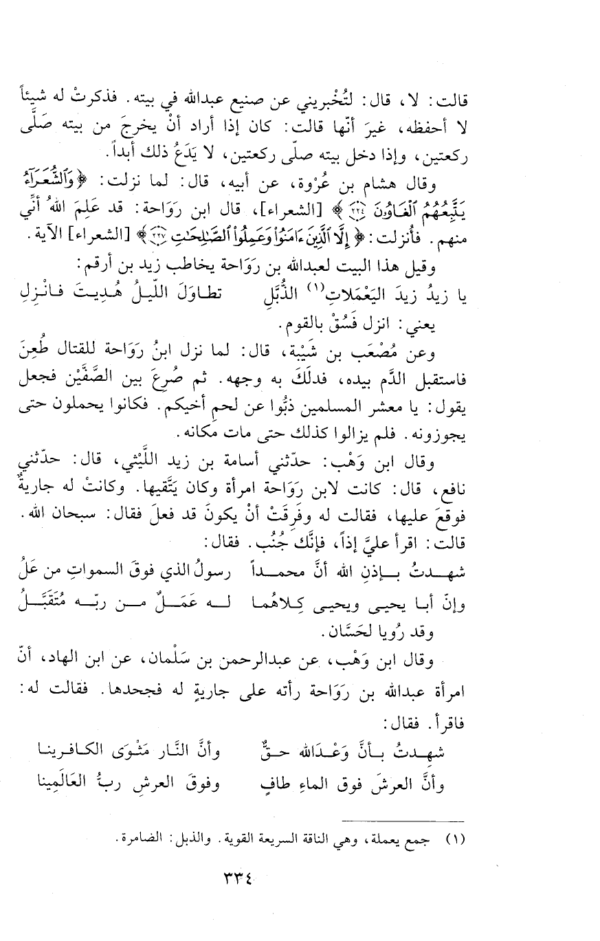 وقال هشام بْن عُرْوة، عَنْ أَبِيهِ قَالَ: لما نزلت " وَالشُّعَرَاءُ يَتَّبِعُهُمُ الْغَاوُونَ " - قَالَ ابن رَوَاحة: قد علم الله أنّي منهم. فأُنزلت " إِلا الَّذِينَ آمَنُوا وَعَمِلُوا الصَّالِحَاتِ " الآية.