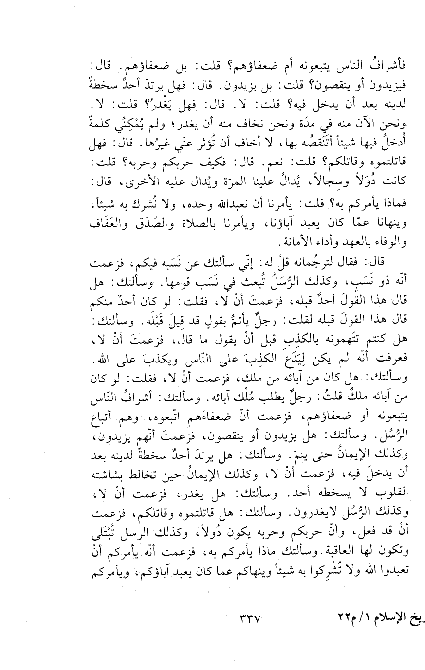 قَالَ: فَهَلْ قَاتَلْتُمُوهُ وَقَاتَلَكُمْ؟ قَلْتُ: نَعَمْ. قَالَ: فَكَيْفَ حَرْبُكُمْ وَحَرْبُهُ؟ قُلْتُ: كَانَتْ دُوَلًا وَسِجَالًا، يُدَالُ عَلَيْنَا الْمَرَّةَ وَيُدَالُ عَلَيْهِ الْأُخْرَى. قَالَ: فَمَاذَا يَأْمُرُكُمْ بِهِ؟ قُلْتُ: يَأْمُرُنَا أَنْ نَعْبُدَ الله وحده، وَلَا نُشْرِكَ بِهِ شَيْئًا، وَيَنْهَانَا عَمَّا كَانَ يعبد آباؤنا، ويأمرنا بِالصَّلَاةِ وَالصِّدْقِ وَالْعَفَافِ وَالْوَفَاءِ بِالْعَهْدِ وَأَدَاءِ الْأَمَانَةِ.