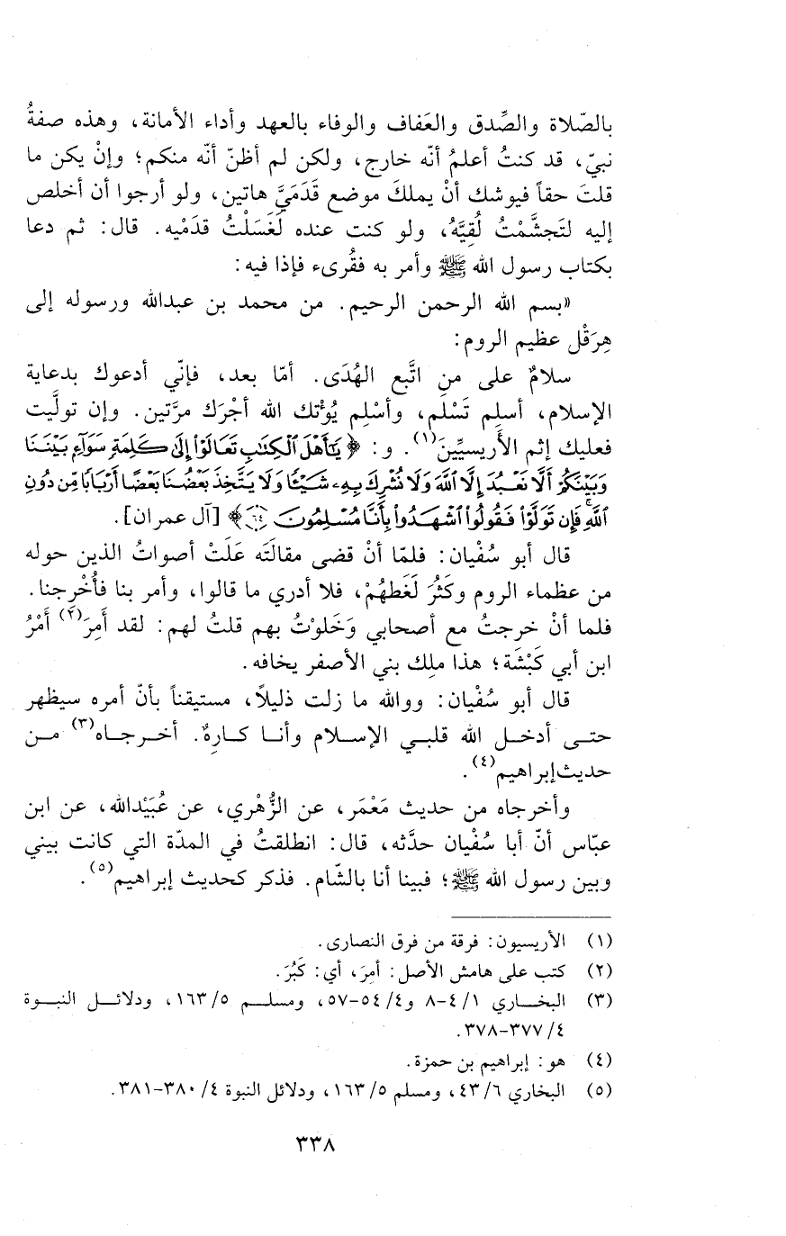 قَالَ: ثُمَّ دَعَا بِكِتَابِ رَسُولِ اللَّهِ صَلَّى اللَّهُ عَلَيْهِ وَسَلَّمَ، وأمر به فَقُرِئَ، فَإِذَا فِيهِ: " بِسْمِ اللَّهِ الرَّحْمَنِ الرَّحِيمِ. مِنْ مُحَمَّدِ بْنِ عَبْدِ اللَّهِ وَرَسُولِهِ إِلَى هرقل عظيم الروم، سلام عَلَى من اتَّبع الْهُدَى.