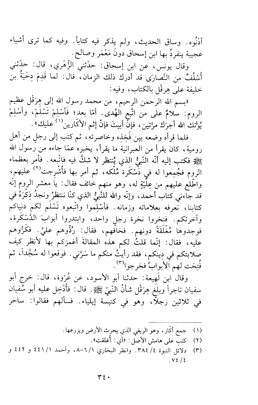 وَقَالَ يُونُسُ عَنِ ابْنِ إِسْحَاقَ: حَدَّثَنِي الزُّهْرِيُّ قَالَ: حَدَّثَنِي أُسْقُفٌّ مِنَ النَّصَارَى قَدْ أَدْرَكَ ذَلِكَ الزَّمَانَ، قَالَ: لَمَّا قَدِمَ دِحيَةُ بْنُ خَلِيفَةَ عَلَى هِرقْلَ بِالْكِتَابِ، وَفِيهِ: بِسْمِ اللَّهِ الرَّحْمَنِ الرَّحِيمِ، مِنْ مُحَمَّدٍ رَسُولِ اللَّهِ إِلَى هِرَقْلَ عظيم الروم: سلام عَلَى من اتَّبع الْهُدَى. أما بعدُ فأسلم تسلم، وَأَسْلِمْ يُؤْتِكَ اللَّهُ أَجْرَكَ مَرَّتَيْنِ، فَإِنْ أَبَيْتَ فَإِنَّ إِثْمَ الأَكَّارِينَ عَلَيْكَ.