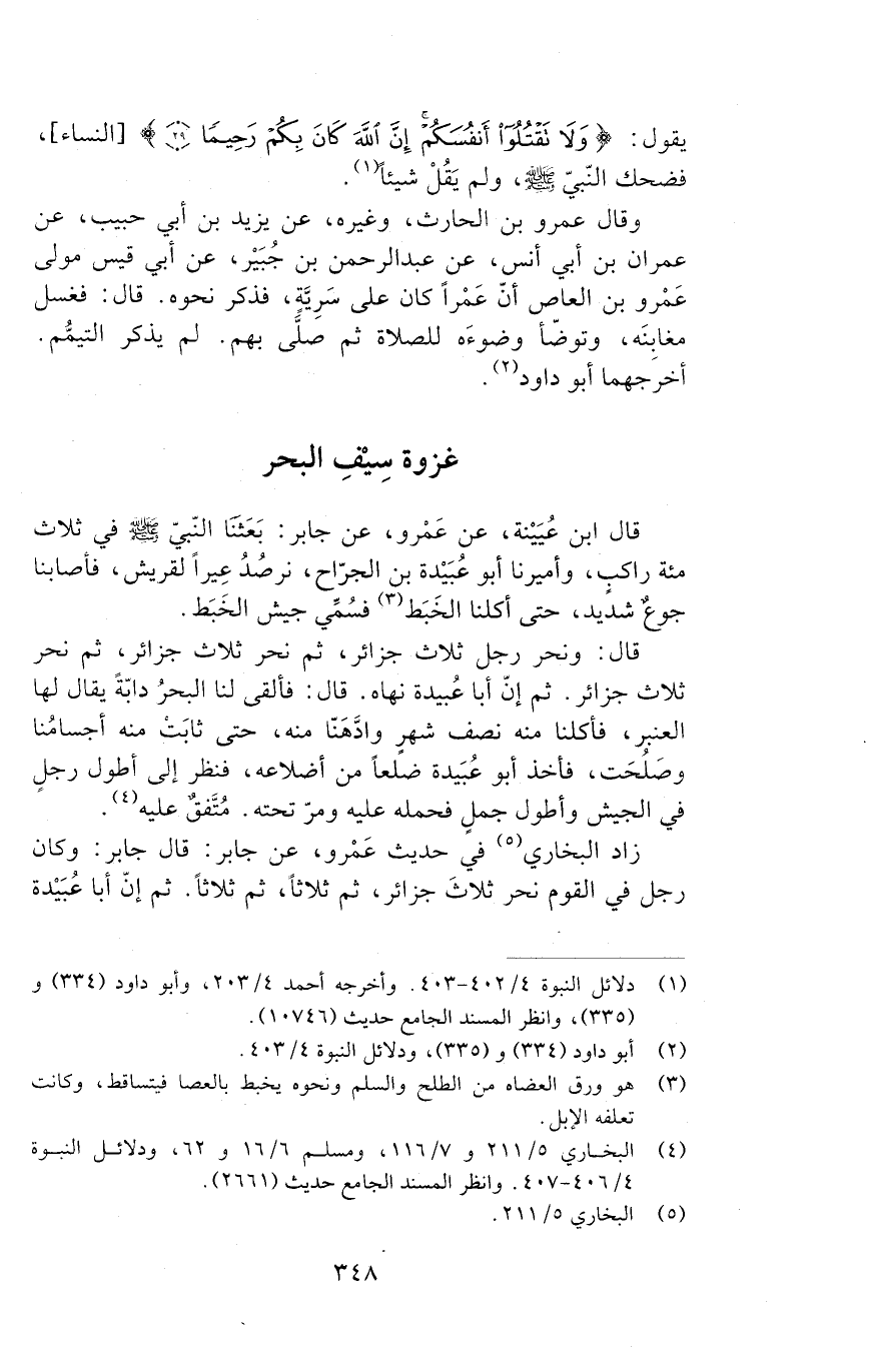 قَالَ: وَنَحَرَ رَجُلٌ ثَلَاثَ جَزَائِرَ، ثُمَّ نَحَرَ ثَلَاثَ جَزَائِرَ، ثُمَّ نَحَرَ ثَلَاثَ جَزَائِرَ. ثُمَّ إِنَّ أَبَا عُبَيْدَةَ نَهَاهُ. قَالَ: فَأَلْقَى لَنَا الْبَحْرُ دَابَّةً يُقَالُ لَهَا: الْعَنْبَرُ. فَأَكَلْنَا مِنْهُ نِصْفَ شَهْرٍ، وَادَّهَنَّا مِنْهُ، حَتَّى ثَابَتْ مِنْهُ أَجْسَامُنَا وَصَلُحَتْ.