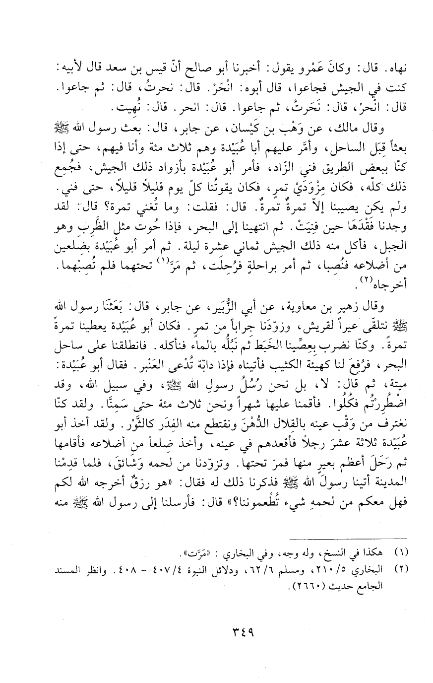 وقال مالك عَنْ وهْب بْن كَيْسان، عَنْ جَابِر قَالَ: بَعَثَ رَسُولُ اللَّهِ صَلَّى اللَّهُ عَلَيْهِ وَسَلَّمَ بعثًا قِبَل الساحل، وأمرّ عليهم أَبَا عبيدة وهم ثلاثمائة وأنا فيهم. حتّى إذا كنّا ببعض الطريق فني الزّاد. فأمر أَبُو عُبَيْدة بأزواد ذَلِكَ الجيش، فجُمِع ذَلِكَ كلّه. فكان مِزْوَدَيْ تمر، فكان يقوتنا كل يوم قليلا قليلا، حتى فني. ولم يكن يصيبنا إلا تمرة تمرة.