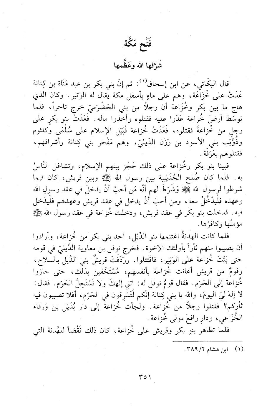 فبينا بنو بَكْر وخُزاعة عَلَى ذَلِكَ حَجَز بينهم الْإِسْلَام، وتشاغل النّاس بِهِ. فلمّا كَانَ صُلح الحُدَيْبية بين رسول الله صلى الله عليه وسلم وبين قريش، كَانَ فيما شرطوا لرَسُول اللَّهِ صَلَّى اللَّهُ عَلَيْهِ وَسَلَّمَ وَشَرَطَ لهم أنّه من أحب أن يدخل في عقد رسول الله وعهده فليدخل معه، ومن أحبَّ أنَّ يدخل فِي عقد قريش وعهدهم فلْيدْخل فِيهِ. فدخلت بنو بَكْر فِي عقد قريش، ودخلت خُزاعة فِي عقد رَسُول اللَّهِ صَلَّى اللَّهُ عَلَيْهِ وَسَلَّمَ مؤمنُها وكافرُها.
