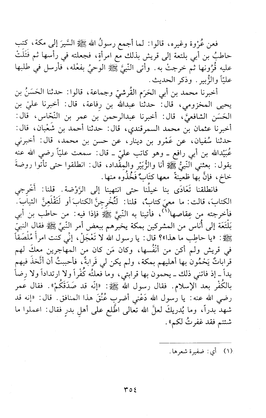 فَانْطَلَقْنَا تَعَادَى بِنَا خَيْلُنَا حَتَّى انْتَهَيْنَا إِلَى الرَّوْضَةِ. قُلْنَا: أَخْرِجِي الْكِتَابَ! قَالَتْ: مَا مَعِي كتاب! قلنا: لتخرجن الكتاب أو لتقلعن الثِّيَابَ! فَأَخْرَجَتْهُ مِنْ عِقَاصِهَا. فَأَتَيْنَا بِهِ النَّبِيِّ صَلَّى اللَّهُ عَلَيْهِ وَسَلَّمَ فَإِذَا فِيهِ: مِنْ حاطب بن أبي بلتعة إلى أناس من المشركين بمكة يُخْبِرُهُمْ بِبَعْضِ أَمْرِ النَّبِيِّ صَلَّى اللَّهُ عَلَيْهِ وَسَلَّمَ. فَقَالَ النَّبِيُّ صَلَّى اللَّهُ عَلَيْهِ وَسَلَّمَ: " يَا حَاطِبُ، مَا هَذَا "؟ قَالَ: يَا رَسُولَ الله، لا تعجل! إني كنت امرأ مُلْصَقًا فِي قُرَيْشٍ، وَلَمْ أَكُنْ مِنْ أَنْفُسِهَا، وَكَانَ مَنْ كَانَ مِنَ الْمُهَاجِرِينَ مَعَكَ لَهُمْ قَرَابَاتٌ يَحْمُونَ بِهَا أَهْلِيهِمْ بِمَكَّةَ، وَلَمْ يَكُنْ لِي قَرَابَةٌ، فَأَحْبَبْتُ أَنْ أَتَّخِذَ فِيهِمْ يَدًا؛ إِذْ فَاتَنِي ذَلِكَ - يَحْمُونَ بِهَا قَرَابَتِي، وَمَا فَعَلْتُهُ كُفْرًا وَلَا ارْتِدَادًا وَلَا رِضًا بِالْكُفْرِ بَعْدَ الْإِسْلامِ! فَقَالَ رَسُولُ اللَّهِ صَلَّى اللَّهُ عَلَيْهِ وَسَلَّمَ: " إِنَّهُ قَدْ صَدَقَكُمْ! " فَقَالَ عُمَرُ رضي الله عنه: يَا رَسُولَ اللَّهِ، دَعْني أَضْرِبُ عُنُقَ هَذَا الْمُنَافِقِ! قَالَ: " إِنَّهُ قَدْ شَهِدَ بَدْرًا، وَمَا يُدْرِيكَ لَعَلَّ اللَّهَ تَعَالَى اطَّلَعَ عَلَى أَهْلِ بَدْرٍ فَقَالَ: اعْمَلُوا مَا شِئْتُمْ فَقَدْ غَفَرْتُ لكم "؟